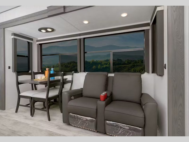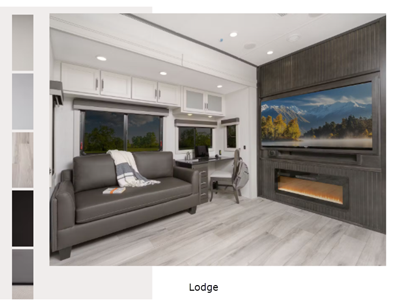 Sleeps 6 Slides 4 Length 38 ft 11 in Ext Width 8 ft 4 in Ext Height 13 ft 4 in Interior Color Dovetail, Lodge Hitch Weight 2620 lbs Dry Weight 13105 lbs Cargo Capacity 3395 lbs Fresh Water Capacity 75 gals Grey Water Capacity 83 gals Black Water Capacity 49 gals Tire Size ST235/80R16G Furnace BTU 35000 btu Available Beds King Refrigerator Type Residential Refrigerator Size 18 cu ft Cooktop Burners 3 Number of Awnings 2 Axle Weight 7000 lbs LP Tank Capacity 30 lbs. Water Heater Type On Demand AC BTU 30000 btu TV Info LR 65" Smart HD TV Awning Info 10' & 16' Power Carefree w/Adjustable Arms Axle Count 2 Washer/Dryer Available Yes Number of LP Tanks 2 Shower Type Standard Electrical Service 50 amp Similar Floorplans