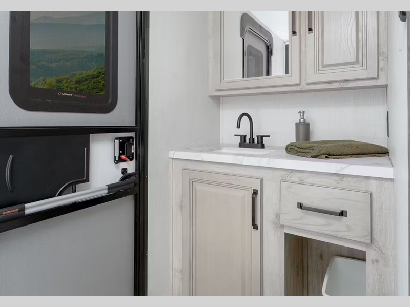 - Premium Lippert® Titan-BaseCamp 6-point Hydraulic auto-leveling system (includes larger landing gear, LED lights at all jack posts, and intuitive touch screen w/ integrated BlueTooth capabilities)