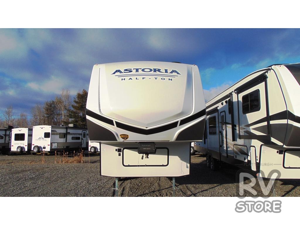 Each one of these Dutchmen RV Astoria Half-Ton fifth wheels feature a fiberglass exterior for added durability and an All Weather Thermal Package so you can camp all year long! There are also Secure Stance entry steps, slam latch baggage doors, an outside shower port, and many more exterior conveniences. You'll enjoy a 200W solar panel for off-grid capabilities, a back up camera for easy parking, and a power awning with LED lights for an inviting outdoor space. The interior is designed with high-gloss acrylic backsplash, night shades throughout the living area, and slick black appliances. The 60,000 BTU tankless water heater will provide endless hot showers, and the 15,000 BTU ducted A/C will keep you cool all summer long.