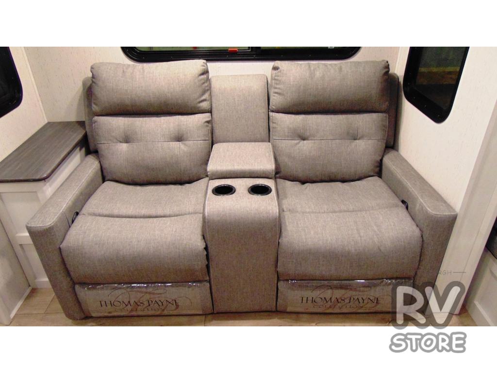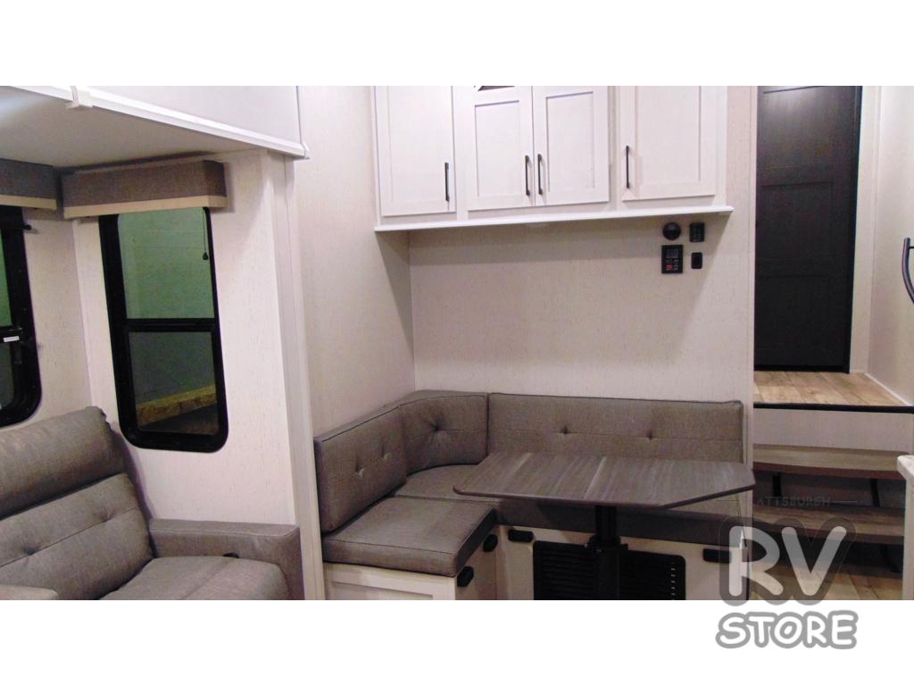 Plan to say awhile in this rear kitchen fifth wheel! You will fall in love with the front bedroom with a king bed slide out, large front closet, a dresser, plus a mounted TV for movies in bed. The rear kitchen includes plenty of space to prep meals, a farm style sink, plus a 10 cu. ft. 12V refrigerator and a pantry for food storage! You can get cozy on the theater seating slide out or at the cafe dinette, and the LED TV will ensure you'll never go bored on rainy days!
