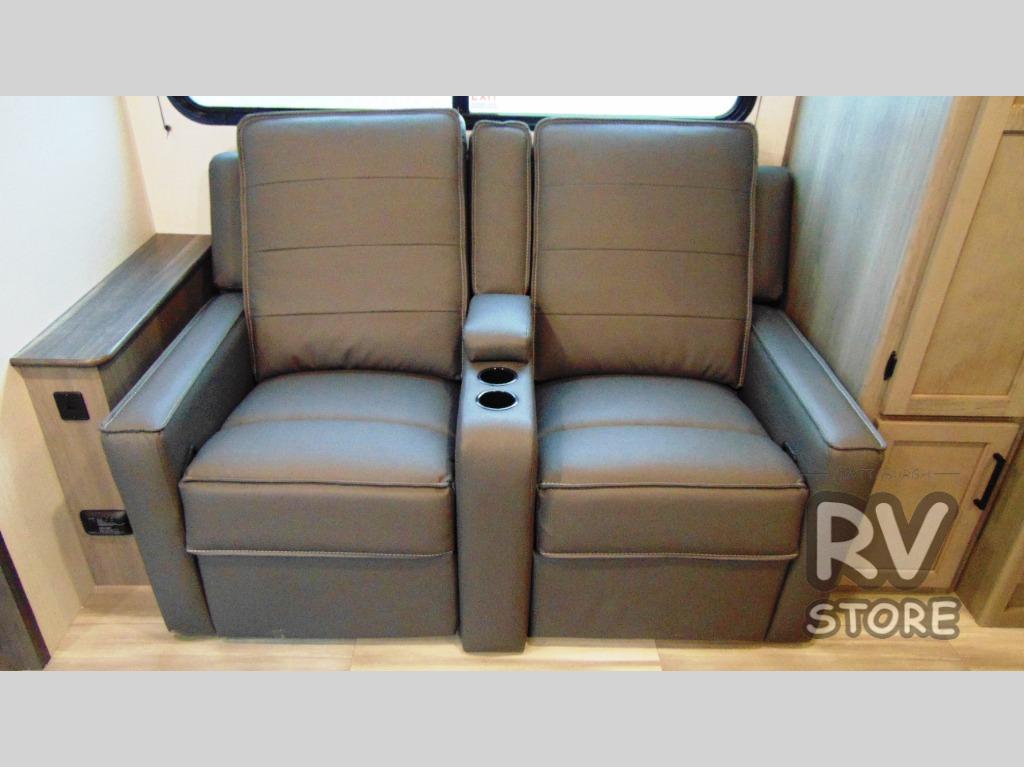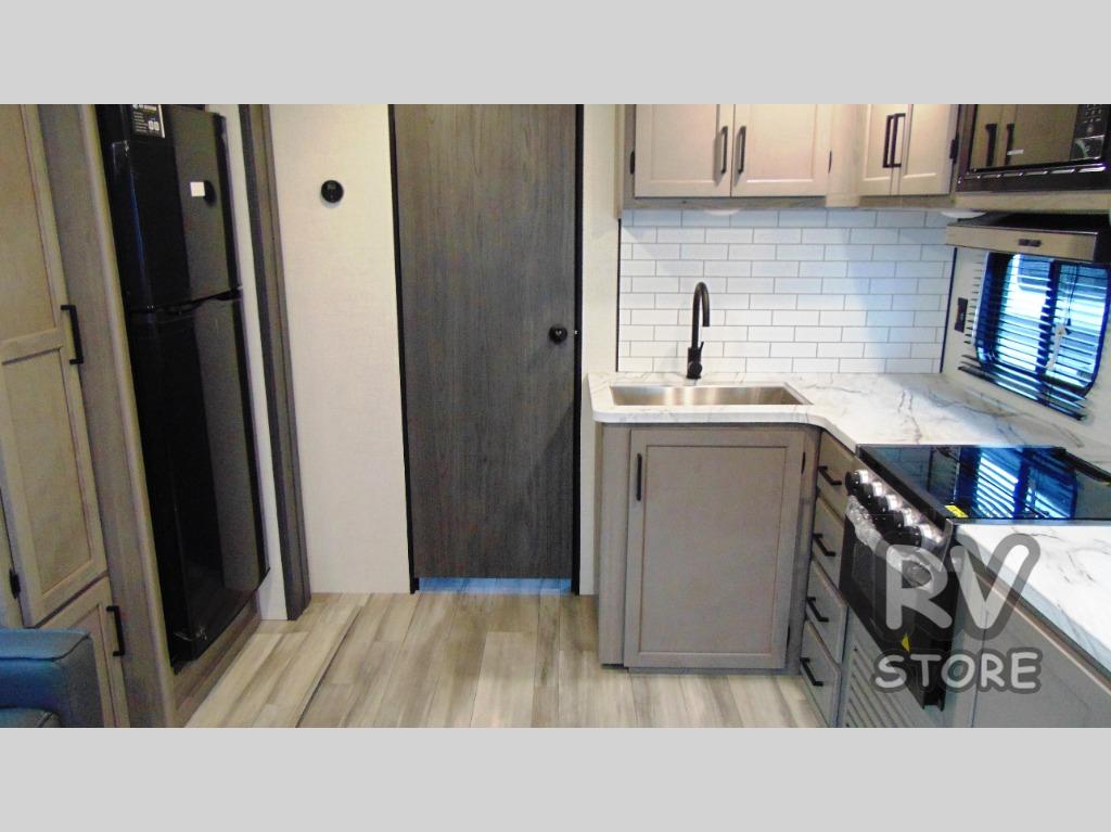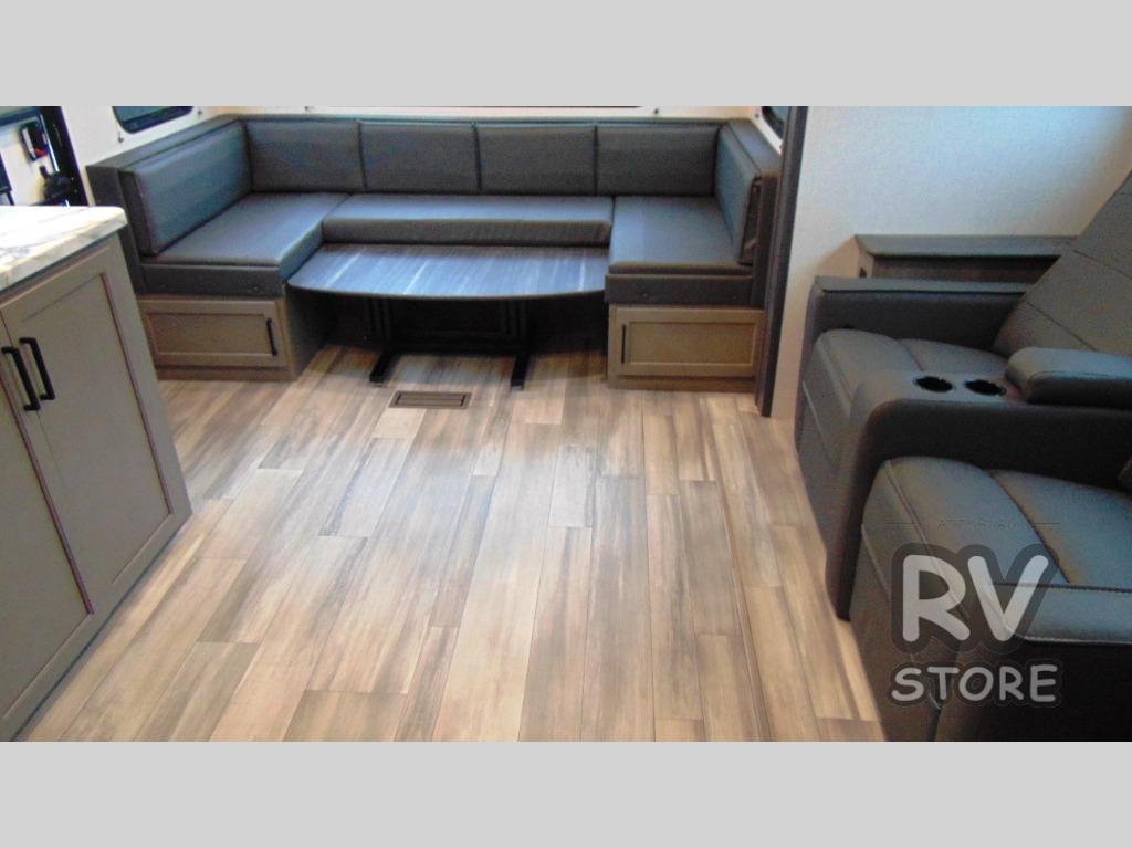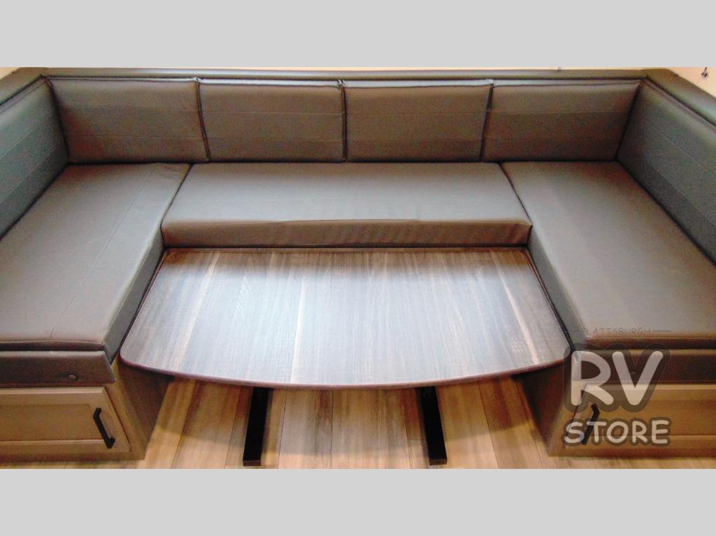 Enjoy every camping trip in this spacious dual entry travel trailer for six. You will love the rear U-dinette and the standard sofa within the large slide out, and there is TV prep in the living area if you plan to bring along your television. You could also choose the optional tri-fold sofa or optional theater seating if you need more seating or sleeping space. Home cooked meals can be whipped up in a hurry on the three burner range, and there is plenty of counter space to cut up fresh veggies. The walk-through bath is convenient for everyone to access, and here you'll find a spacious shower and a linen closet for clean towels. Head to the master bedroom where you'll be met with a queen bed, dual nightstands and closets, a laundry chute, plus your own exterior entry door; how convenient. The exterior even has an outdoor refrigerator for cold drinks under the awning!