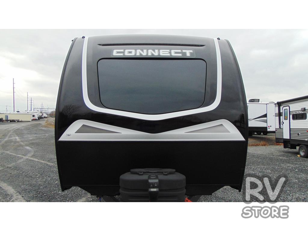 You can use this Connect travel trailer whenever you want to get away! You will remain comfortable each night sleeping in the master suite with a spacious full rear bath where you can freshen up each day. There is also a wardrobe with washer and dryer prep, plenty of counter space, and a wardrobe with outside storage for hiking gear. The front kitchen has a full-width countertop for lots of extra space to chop veggies and prep meals, and the large slide in the main living area holds the booth dinette and hide-a-bed sofa. These pieces of furniture rest across from the 34" fireplace for a cozy evening with a cup of coffee, and there is a hidden pantry where you can grab snacks.