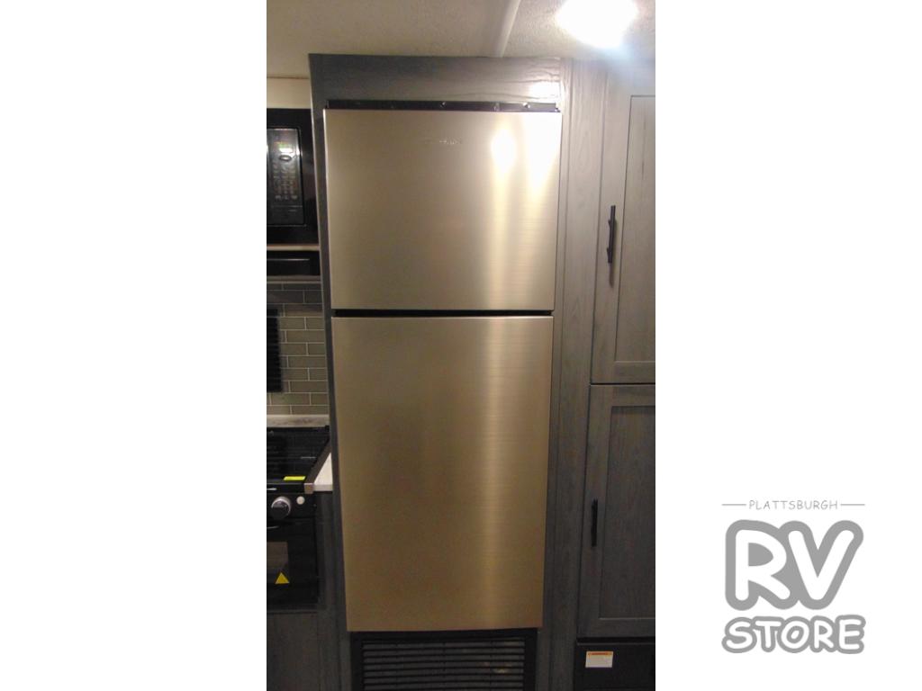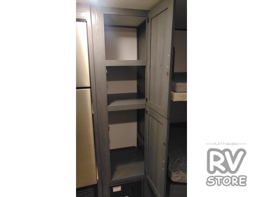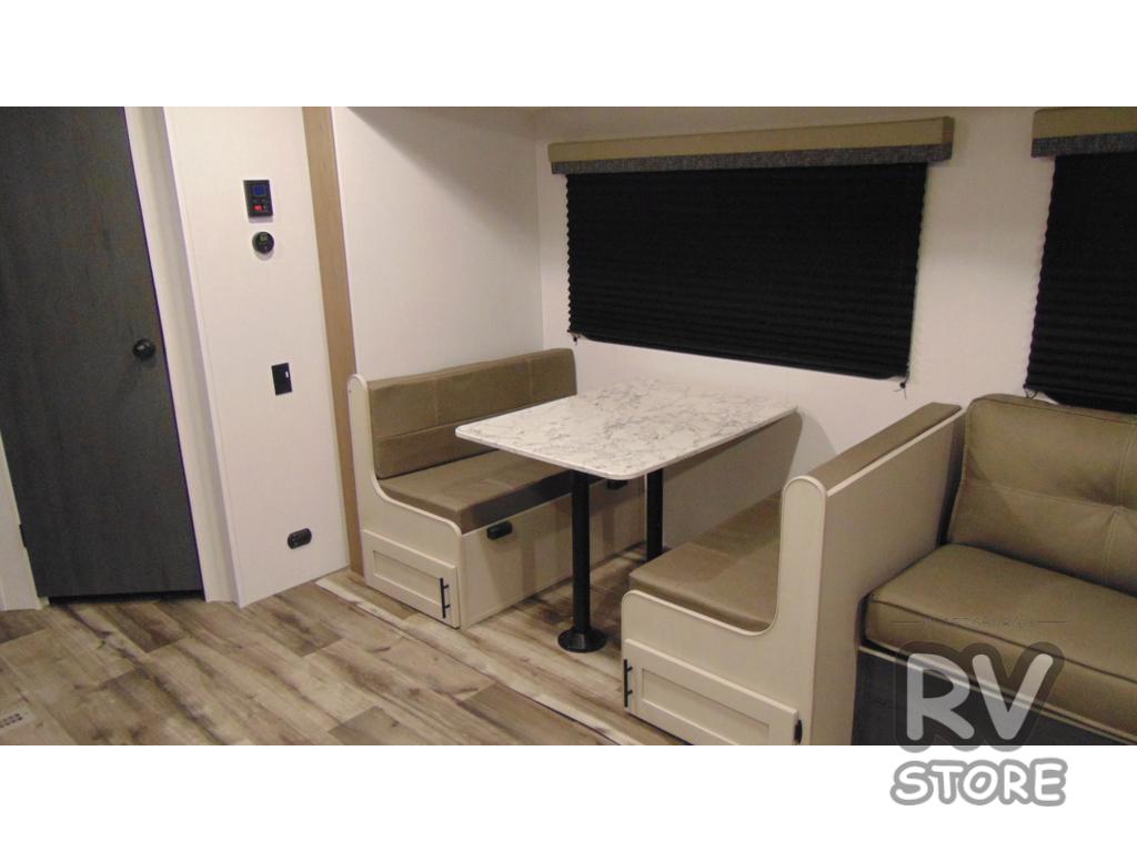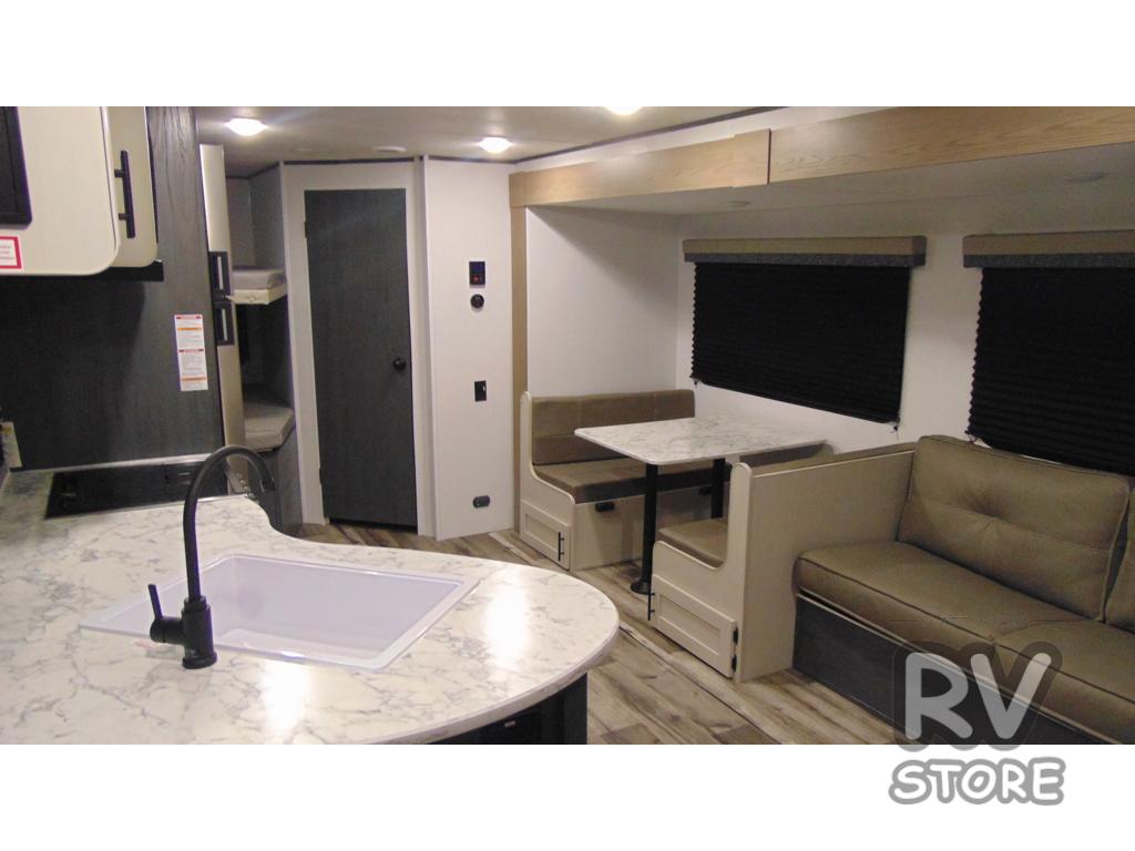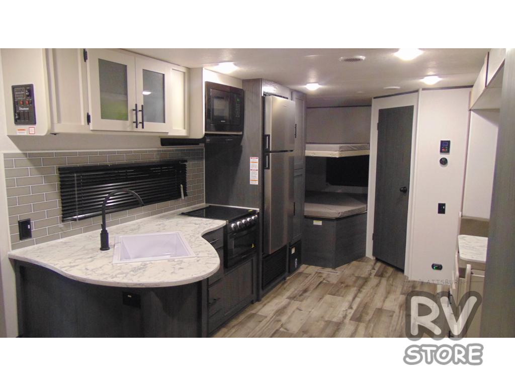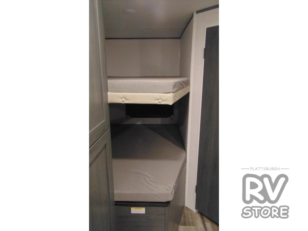 Get ready for fun and relaxation at the campgrounds with this trailer in your campsite. You can fish in the river, hike the trails and relax under the power awning before heading inside to enjoy the comforts of home. You will also enjoy having double access to the private bedroom which offers a residential queen bed and dual closets, plus the full bathroom will keep you refreshed after outdoor fun. The double-size bunks offer sleeping for four, and the furniture doubles as extra sleeping space. The cook will have full amenities including a 10 cu. ft. 12V refrigerator to store lots of cold items. And the single slide gives everyone more floor space.