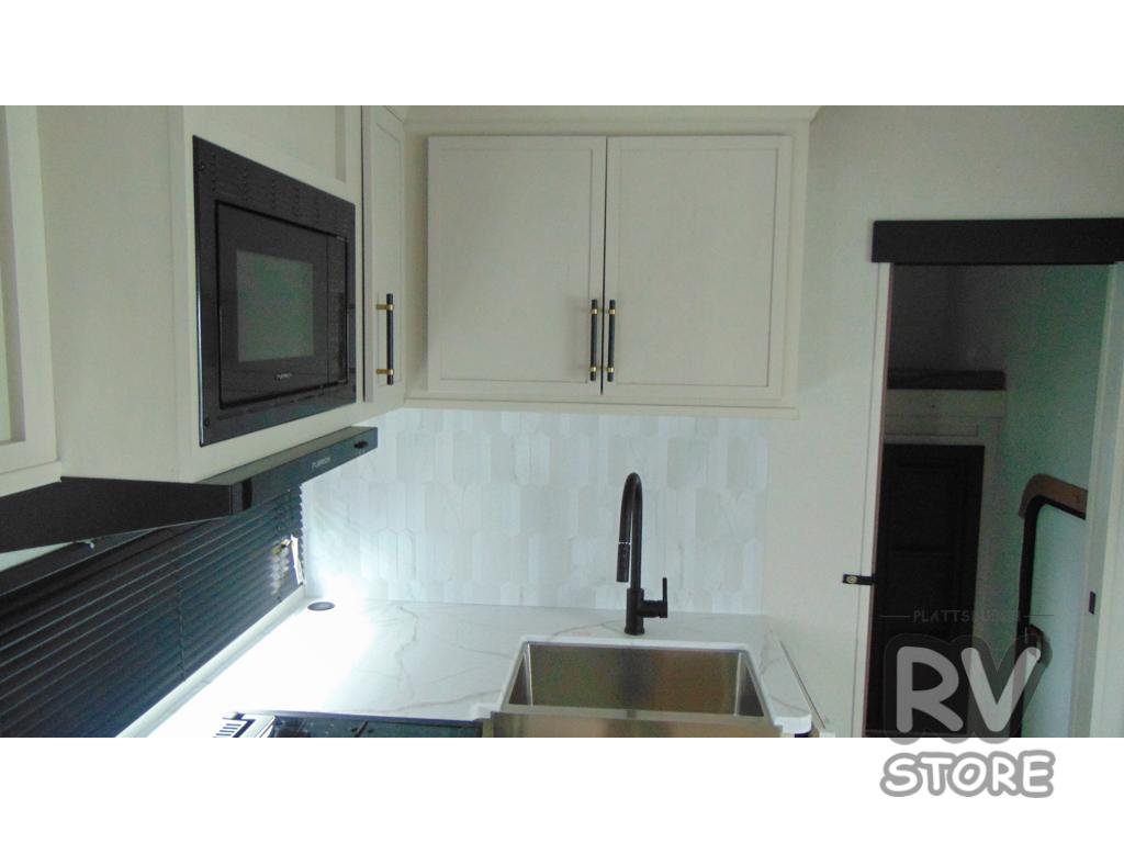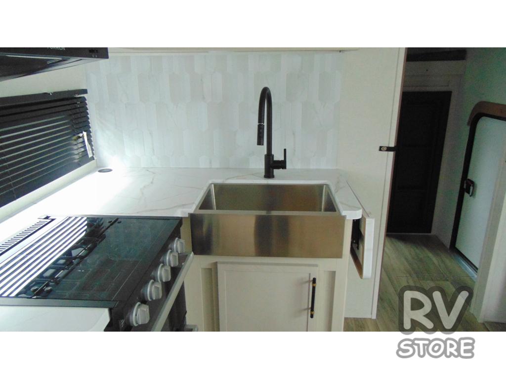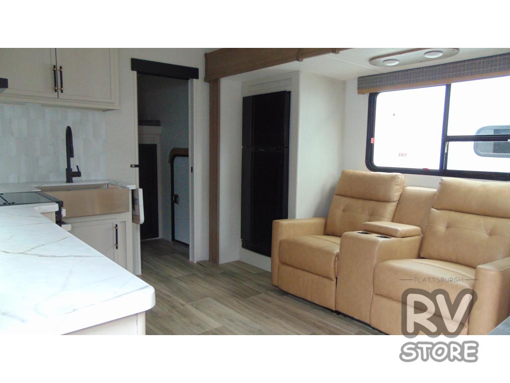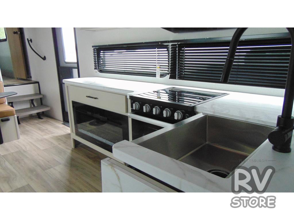 You'll enjoy every minute in this cozy fifth wheel. There is a front private bedroom with a queen bed, dual closets, and a closet with washer and dryer prep that will make your space feel just like home. Your guests will love having the rear private bunkhouse to themselves with three bunks, and there is a full bath on board so everyone can stay clean throughout your trip. The theater seating slide out in the living area/kitchen will provide more space to move about, plus there is a cafe dinette for more seating and dining space. An extra guest or two could even sleep on these areas! The chef of your group will find a full kitchen with a farm style sink, 10 cu. ft. double door refrigerator, and three burner range with an oven.