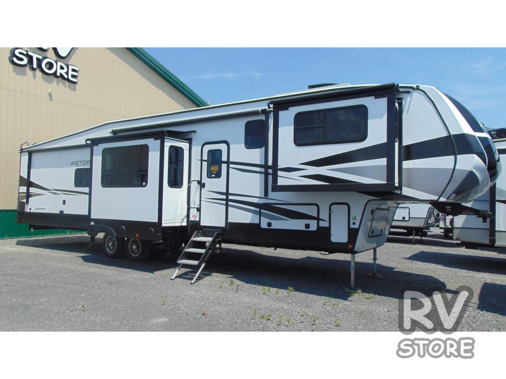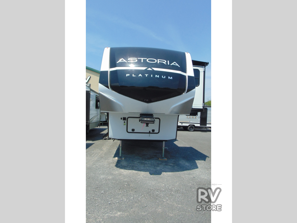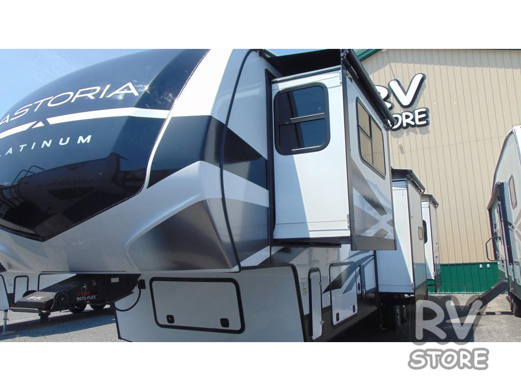 Each one of these Dutchmen RV Astoria Platinum fifth wheels feature a fiberglass exterior for added durability and an All Weather Thermal Package so you can camp all year long! There are also MorRyde Solid entry steps, slam latch baggage doors, and many more exterior conveniences. You'll enjoy a 200W solar panel for off-grid capabilities, an X1 back up camera for easy parking, and a power awning with LED lights for an inviting outdoor space. The interior is designed with bathroom backsplash, night shades throughout the living area, and Thomas Payne furniture collection. The on-demand tankless water heater will provide endless hot showers, and the dual ducted A/C will keep you cool all summer long.