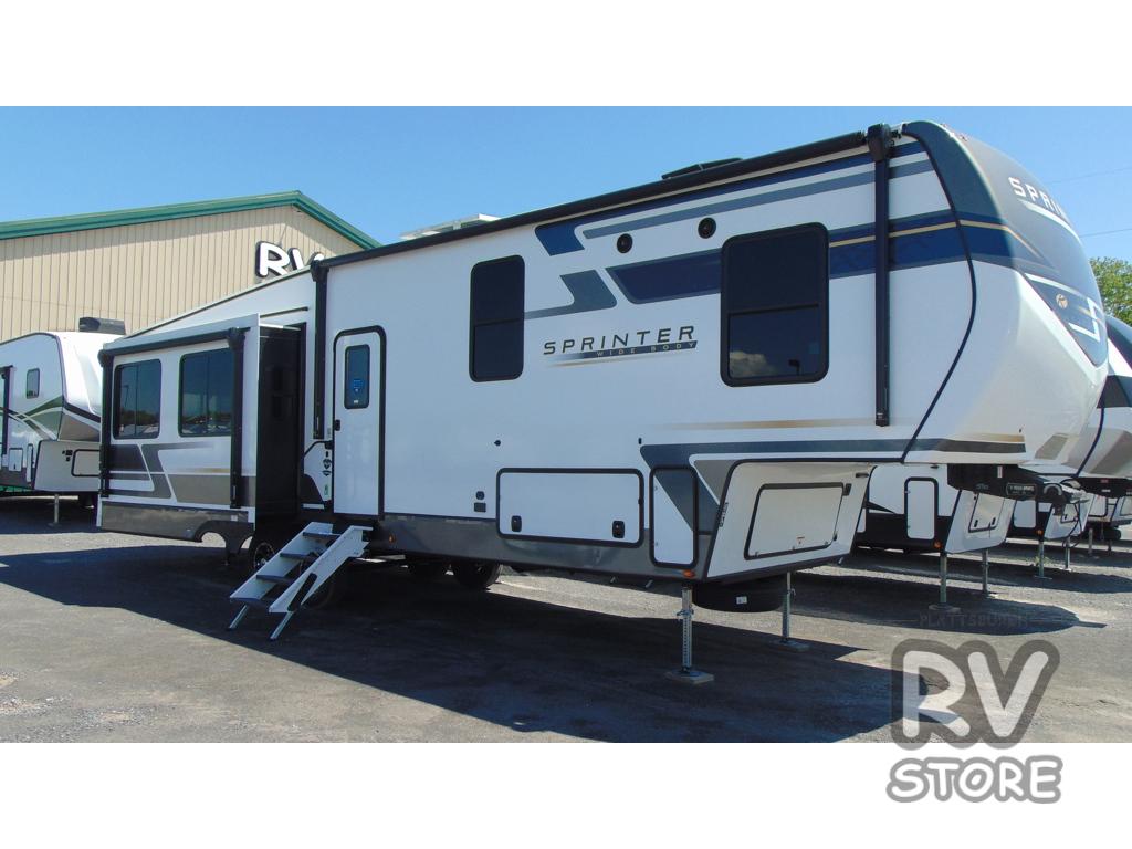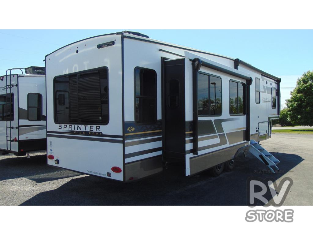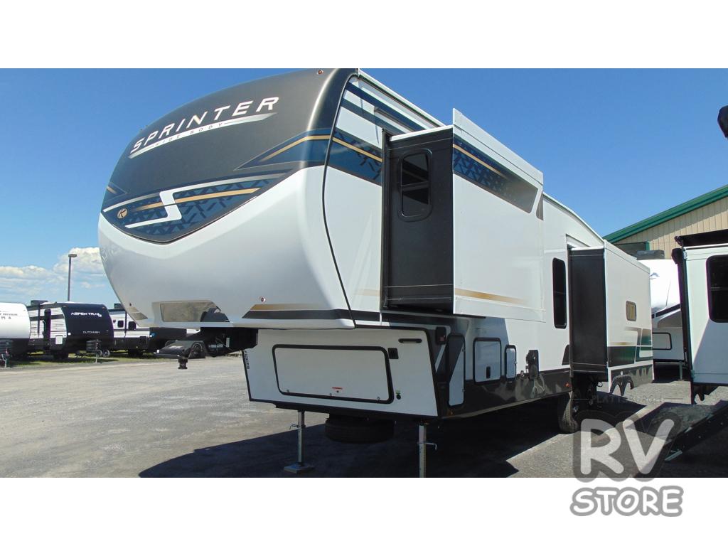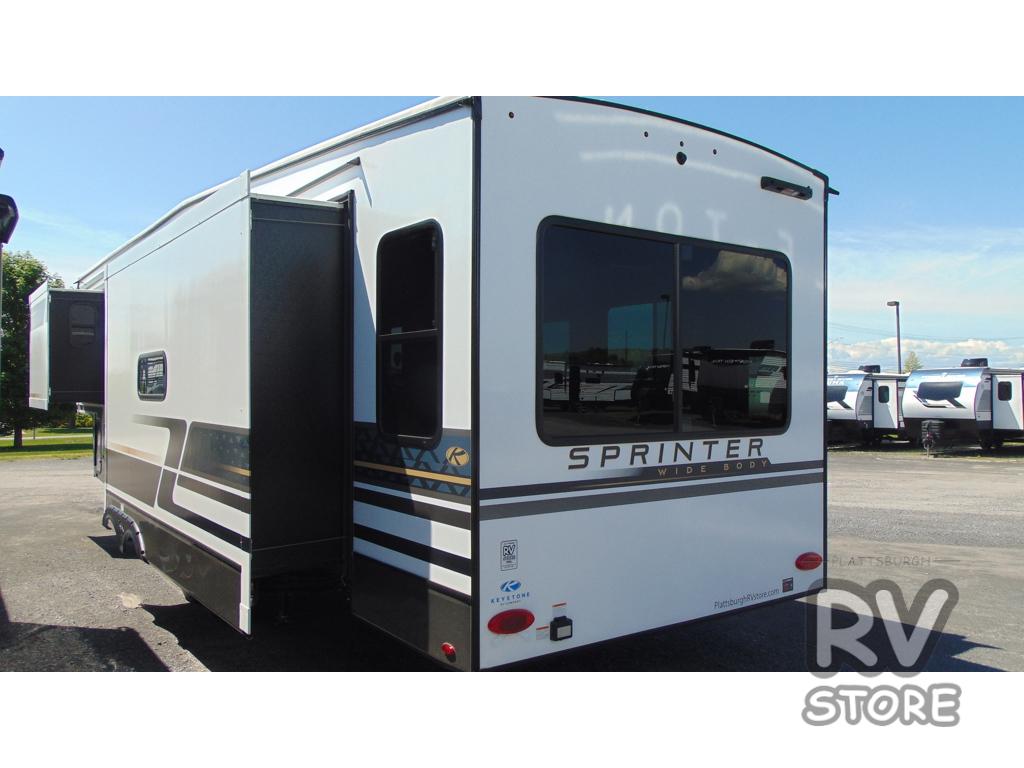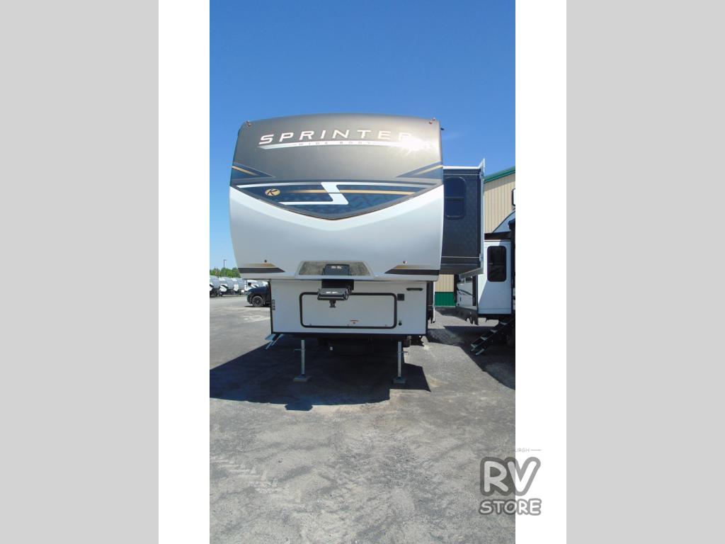 The Sprinter fifth wheels by Keystone feature spacious living areas, plenty of storage, and outstanding towability. Each unit is constructed with 2" aluminum framed and laminated sidewalls, a fully walkable roof, and dual layer insulation to help extend your camping season. The heated pass-through storage includes lockable slam latch baggage doors so you can easily pack your gear, and the one-touch 4-point leveling system features return hookup memory to have you set up in no-time. Head inside to find Congoleum vinyl flooring, Thomas Payne luxury collection furniture, residential style seamless marbled countertops, and an upgraded bedspread to name a few comforts. The Sprinter also includes a Girard tankless on-demand water heater, a central command center, plus a 30k BTU furnace and two A/C units to ensure your comfort!