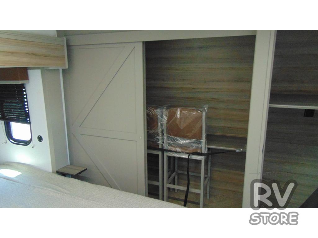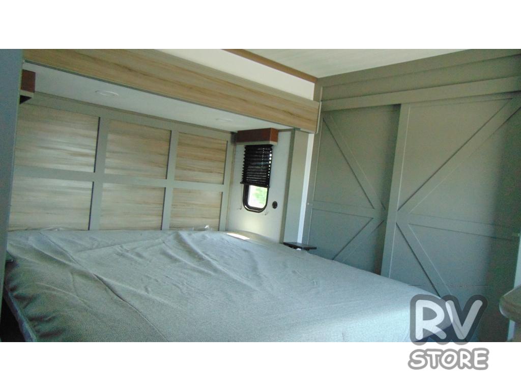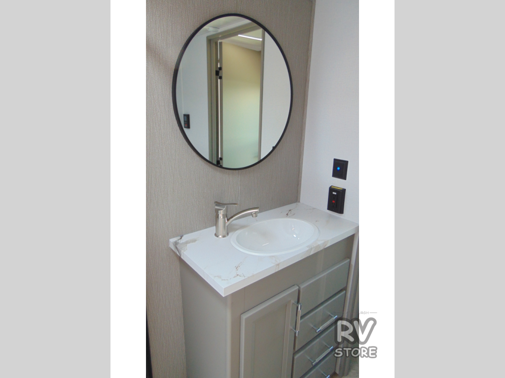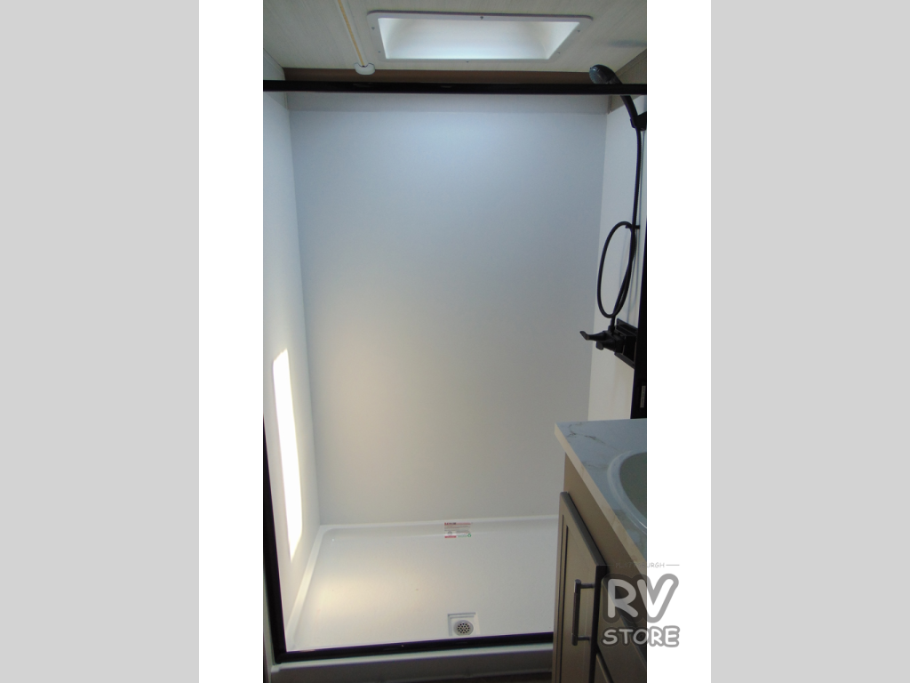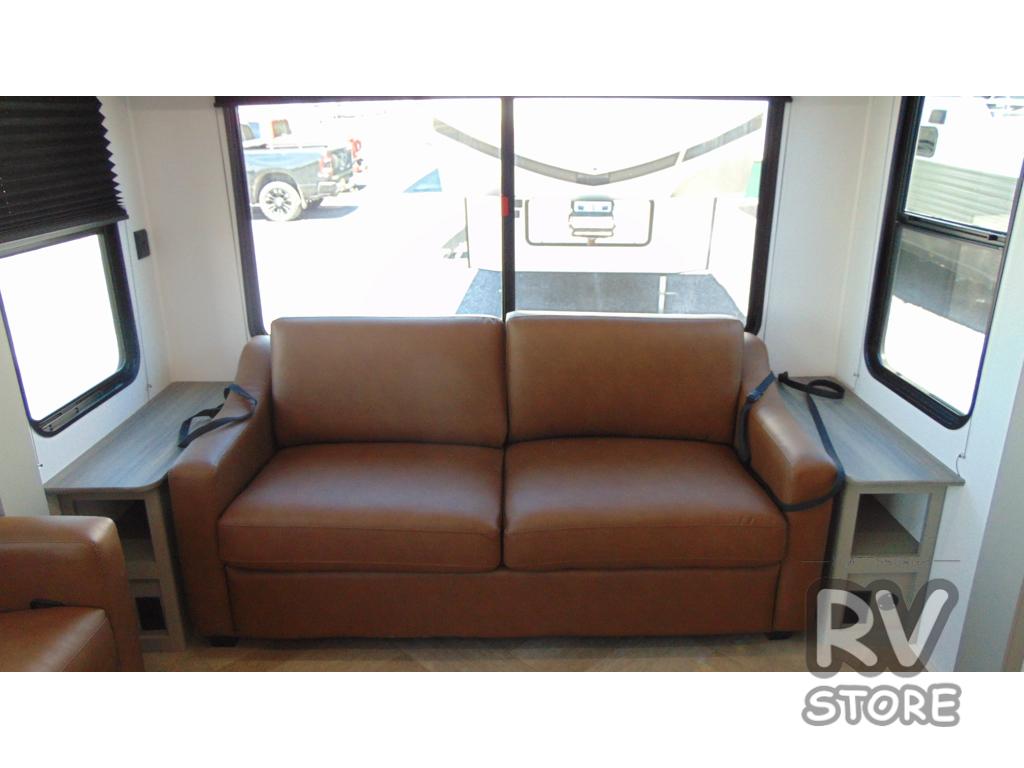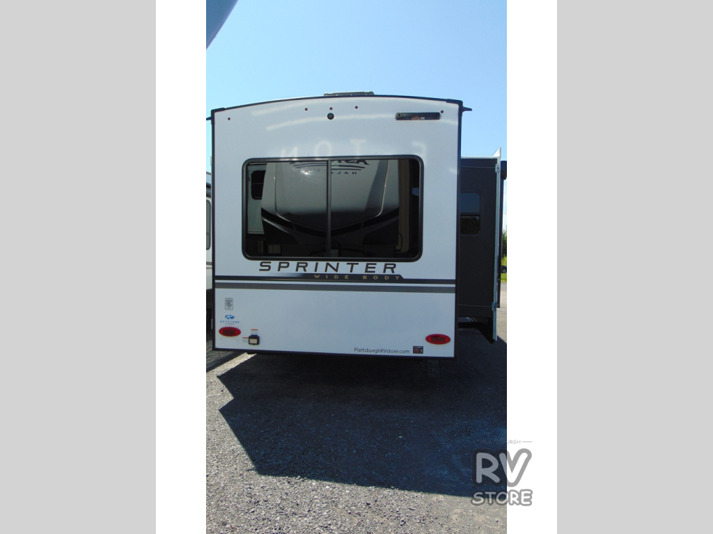 The Sprinter fifth wheels by Keystone feature spacious living areas, plenty of storage, and outstanding towability. Each unit is constructed with 2" aluminum framed and laminated sidewalls, a fully walkable roof, and dual layer insulation to help extend your camping season. The heated pass-through storage includes lockable slam latch baggage doors so you can easily pack your gear, and the one-touch 4-point leveling system features return hookup memory to have you set up in no-time. Head inside to find Congoleum vinyl flooring, Thomas Payne luxury collection furniture, residential style seamless marbled countertops, and an upgraded bedspread to name a few comforts. The Sprinter also includes a Girard tankless on-demand water heater, a central command center, plus a 30k BTU furnace and two A/C units to ensure your comfort!
