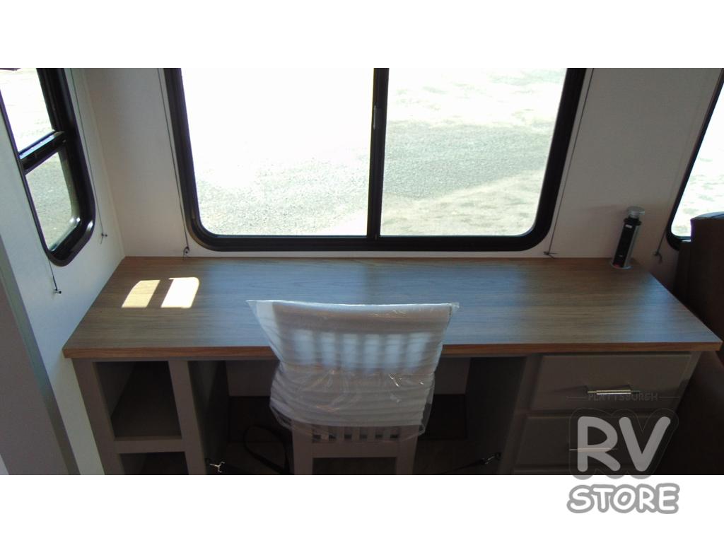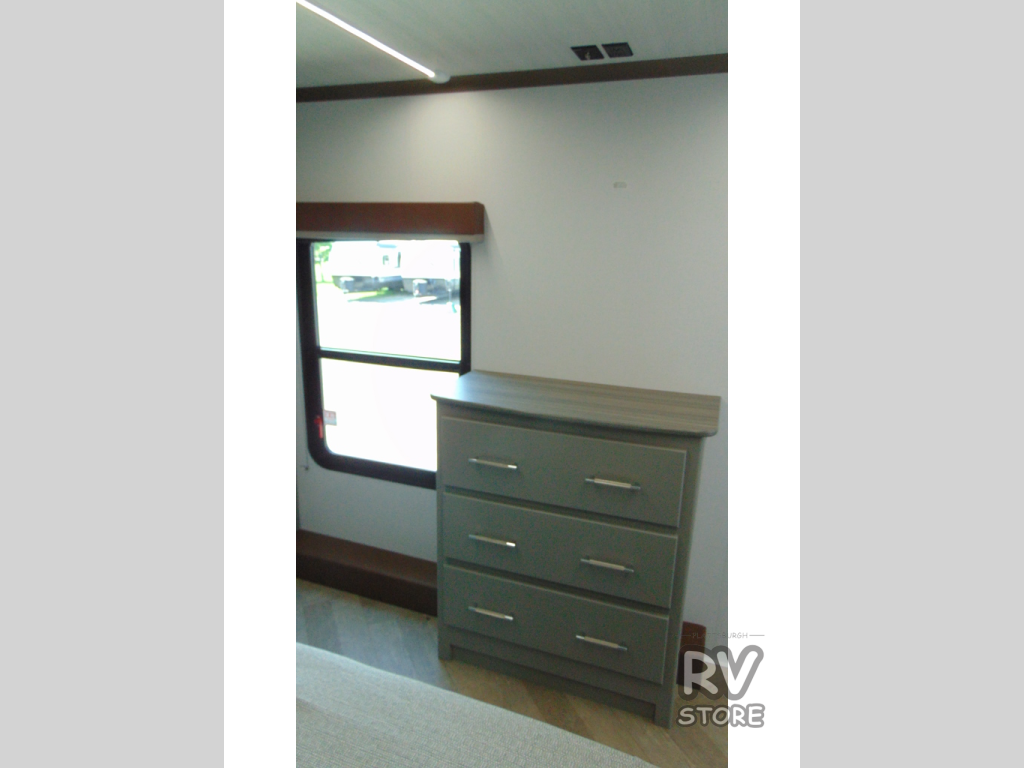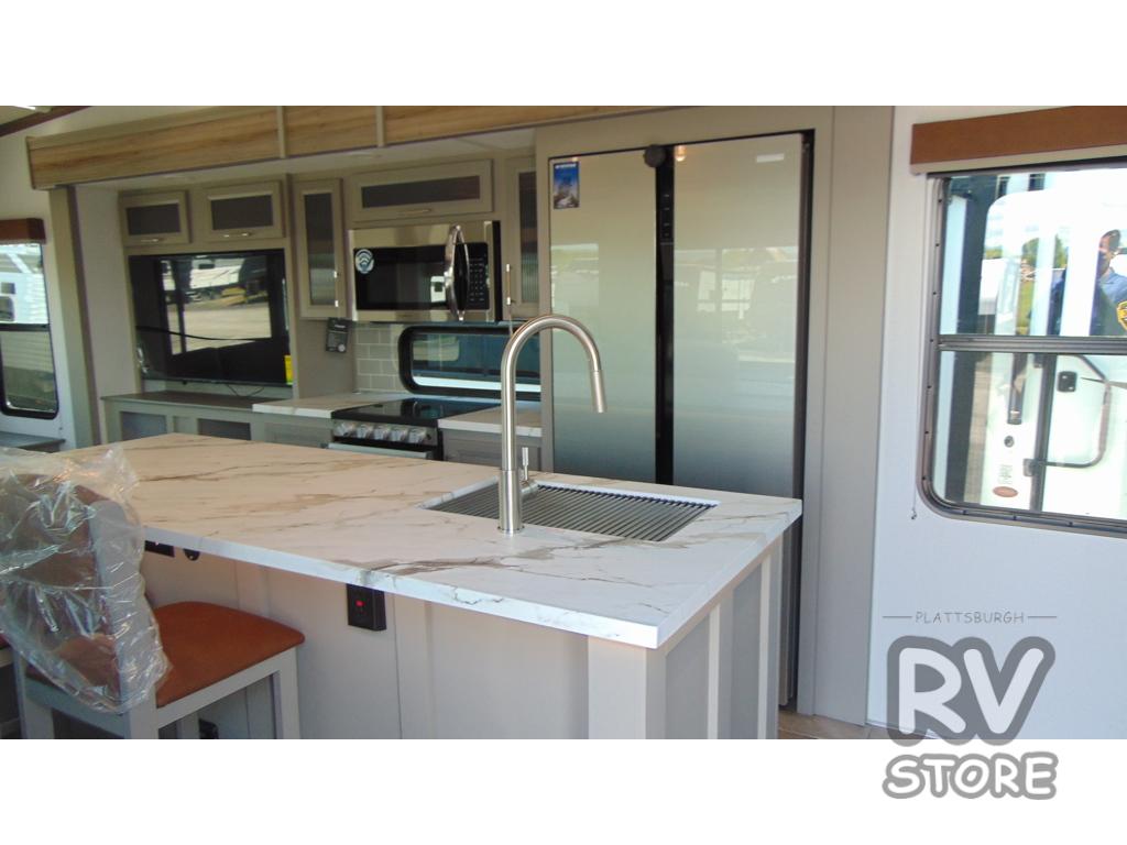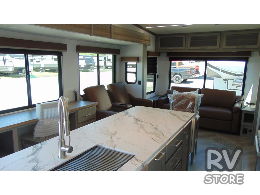 It will be so easy to enjoy camping trips or extended stays in this spacious fifth wheel! There are dual opposing slides in the combined kitchen and living area, giving you plenty of space to relax on the full reclining theater seating across from the fireplace and 50" TV. There is also a desk with drawers and a chair where you can get some work done if needed. The chef of your group will love the 7' kitchen island and double door pantry for dry goods, snacks and more. Your guests can sleep on the rear sofa, while you take the front private bedroom with a king bed slide out. You can keep your things organized in the dresser, wardrobe, and linen closet with stackable washer and dryer prep.