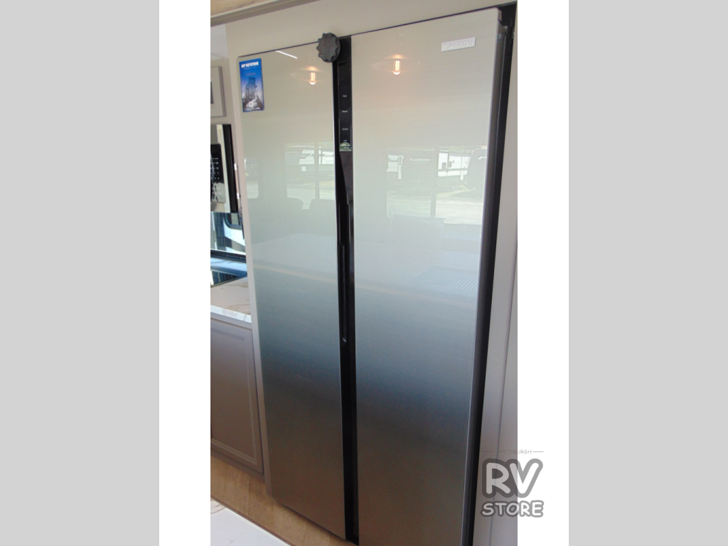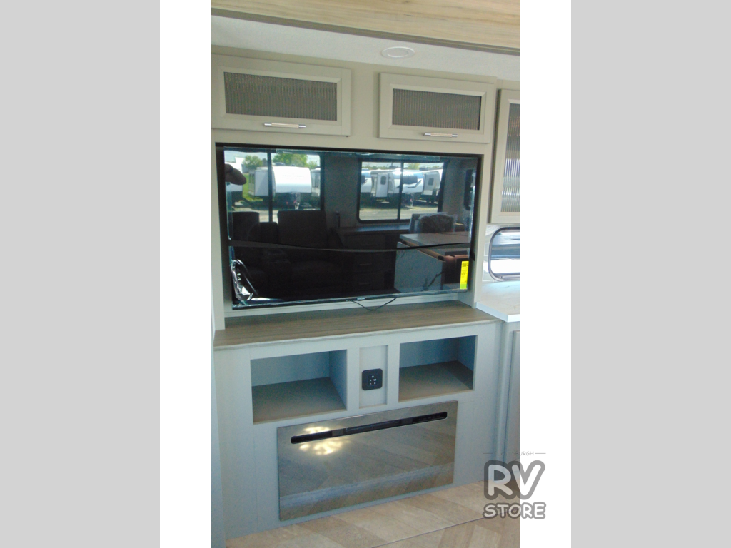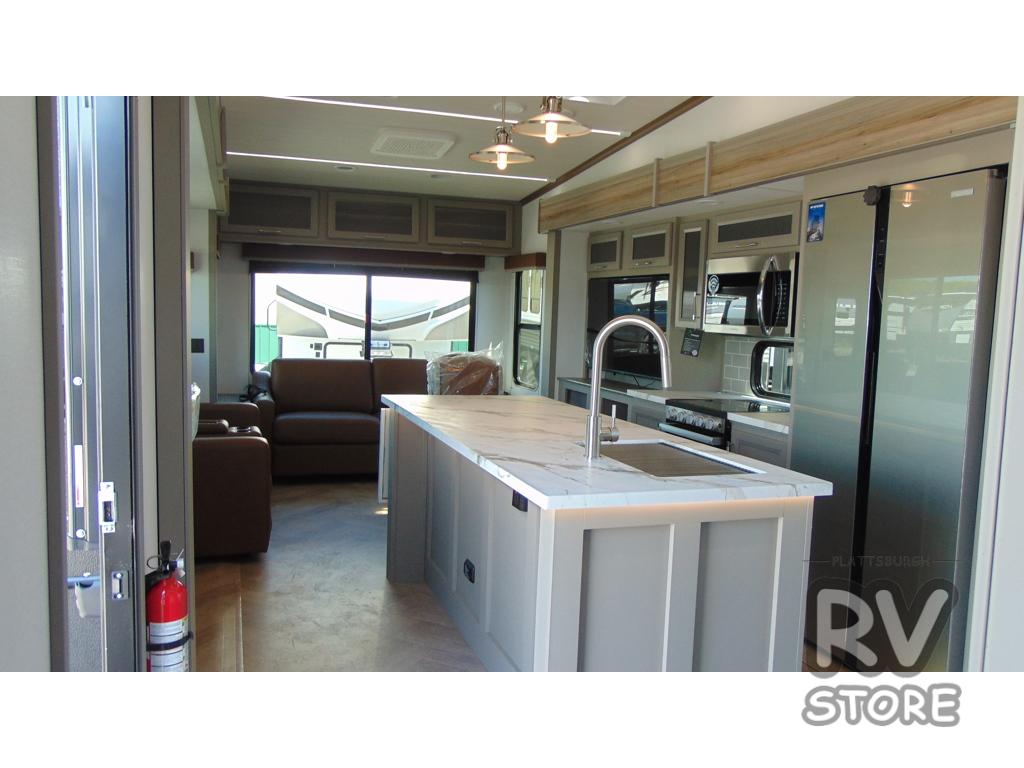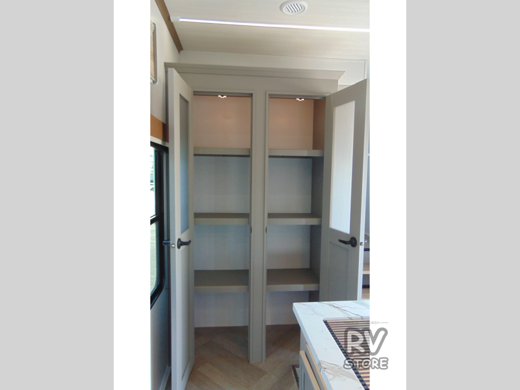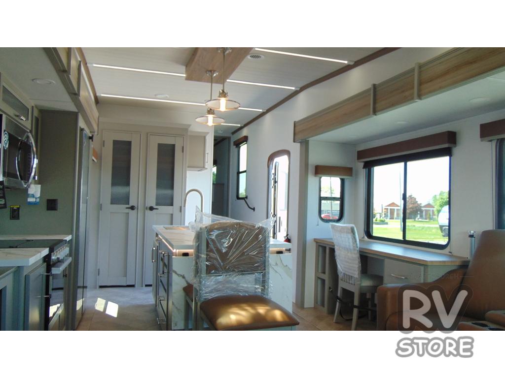 It will be so easy to enjoy camping trips or extended stays in this spacious fifth wheel! There are dual opposing slides in the combined kitchen and living area, giving you plenty of space to relax on the full reclining theater seating across from the fireplace and 50" TV. There is also a desk with drawers and a chair where you can get some work done if needed. The chef of your group will love the 7' kitchen island and double door pantry for dry goods, snacks and more. Your guests can sleep on the rear sofa, while you take the front private bedroom with a king bed slide out. You can keep your things organized in the dresser, wardrobe, and linen closet with stackable washer and dryer prep.