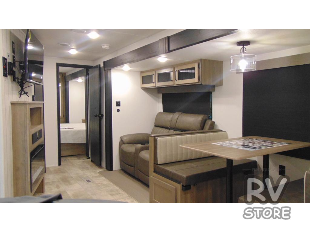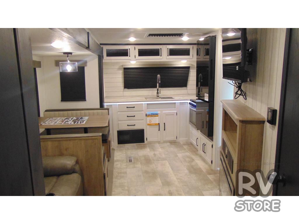 Walk into this travel trailer with one of the dual entry doors for a great camping trip! One entrance enters directly into the rear private bedroom which has a queen bed slide, a walk-in closet with washer and dryer prep, a wardrobe, and even an entrance into the dual entry bathroom. Grab a snack from the walk-in pantry then relax on the sofa while you watch a movie with the entertainment center or play a game at the booth dinette. The front kitchen has everything you will need to prepare your best home cooked meals including lots of countertop space, a stainless steel oven and range, and a stainless steel microwave!