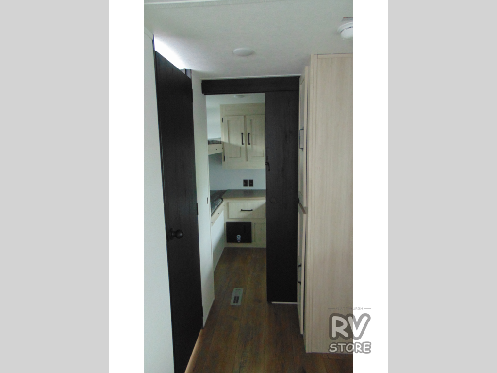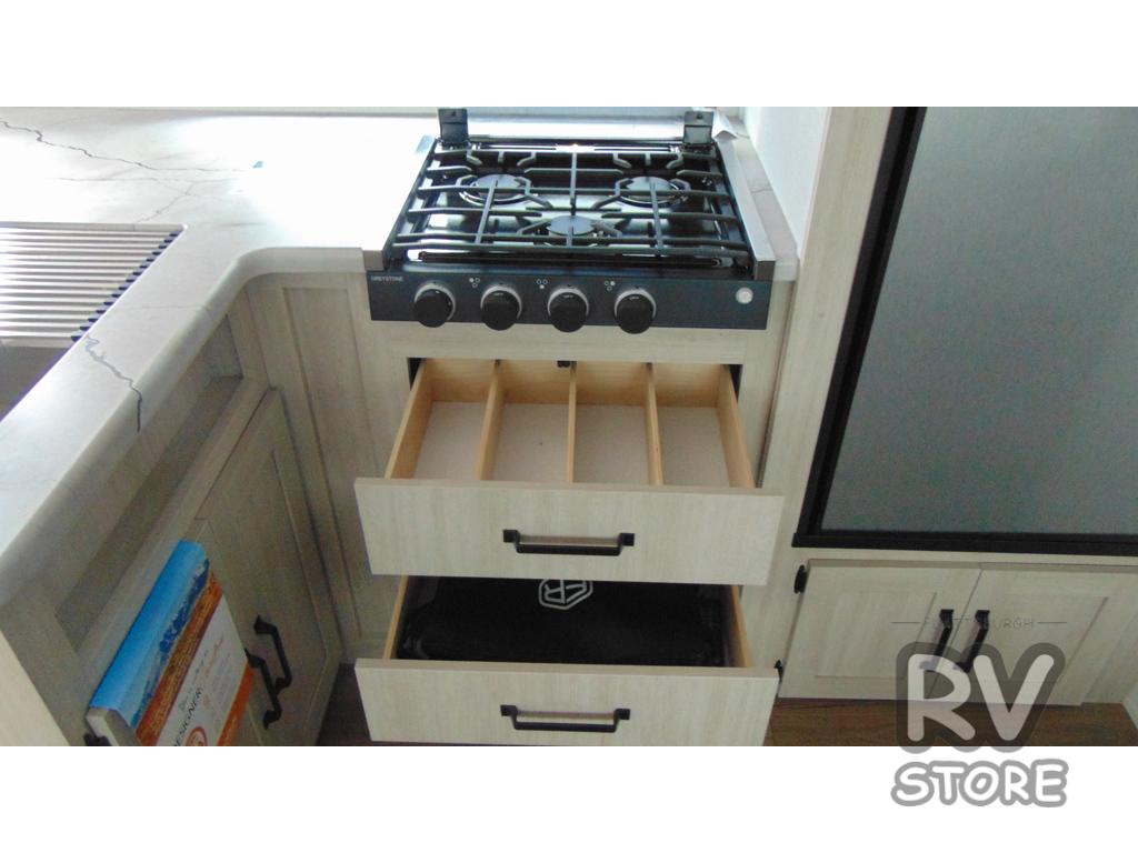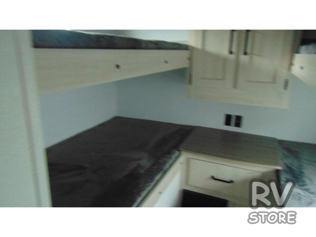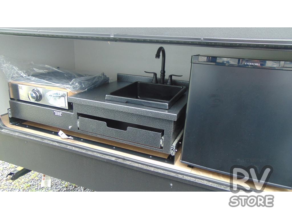 If you're looking for more space, this double axle unit features a large slide so you can walk about freely. Here, you'll find the booth dinette and sofa, which sit across from the optional TV if you want to enjoy movie nights. The full kitchen includes a stainless microwave and three burner cooktop to make meals, plus a pantry and 12V refrigerator for food storage. And an optional outside kitchen with a griddle can be added if you enjoy cooking outdoors! Your guests or littles are sure to enjoy the rear private bunkhouse with four bunk beds and a wardrobe for their things!