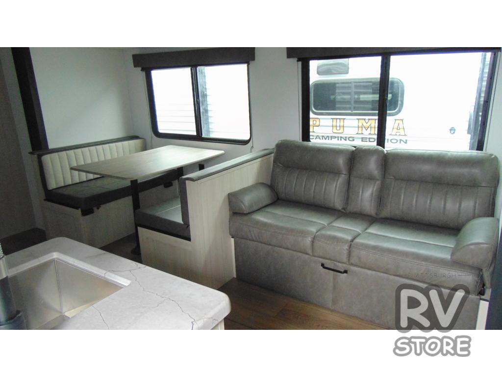 The Puma Camping Edition by Palomino offer an affordable travel trailer for rookie campers or seasoned RVers! They are built with 5/8" tongue and groove plywood flooring and a front diamond plate for added protection. There are also exterior clamp style door latches, back up camera prep, and 20 lb. LP bottles. Head inside to find Thermofoil countertops with a smooth drop edge, bedroom USB ports and outlets, and a GE appliance and kitchen package.