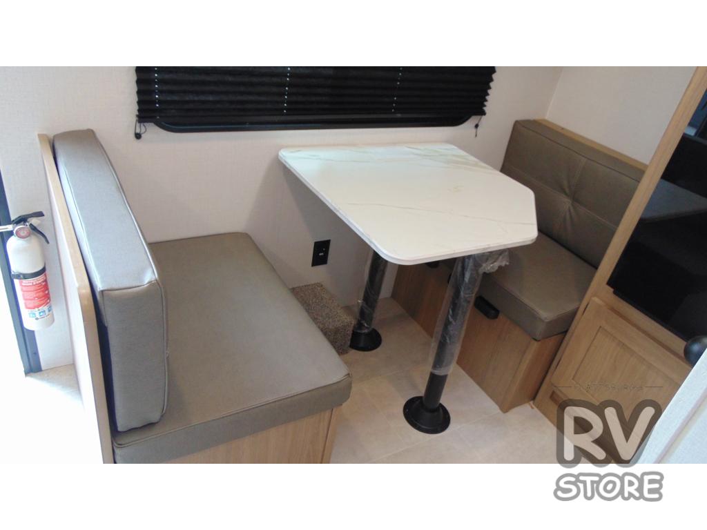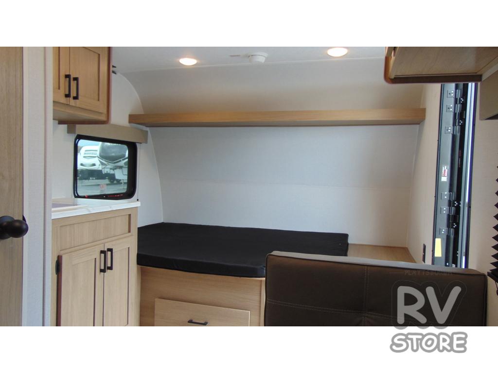 This lightweight unit may surprise you with the comfort found inside. You can sleep comfortably each night on the front full-size bed with an overhead cabinet, and there is a booth dinette that can sleep one to two more. A two-burner cooktop and microwave oven will let you make breakfast for everyone in the morning, and the private bath inside means you won't have to use the camp's facilities to get ready.