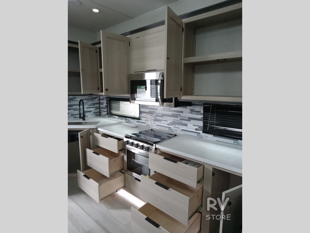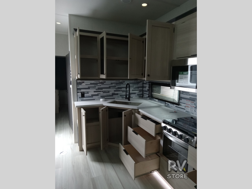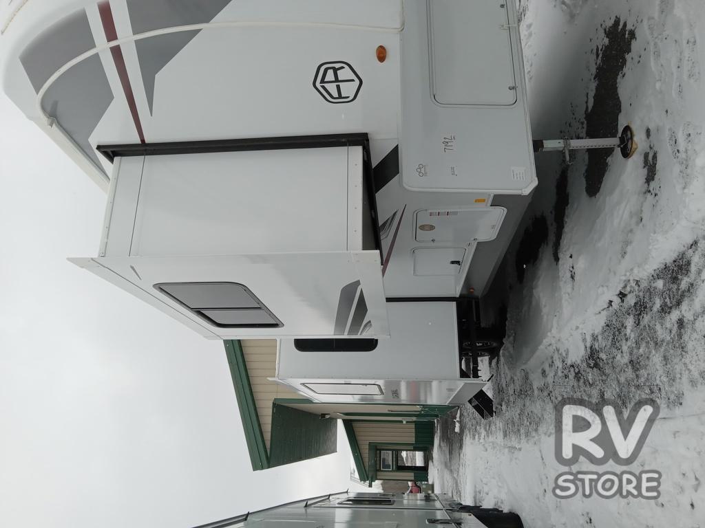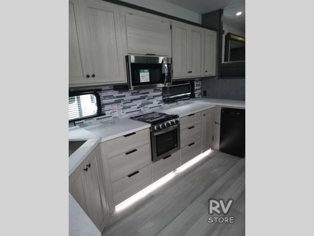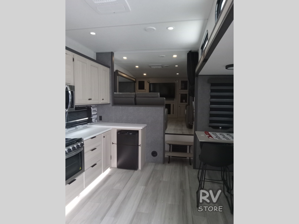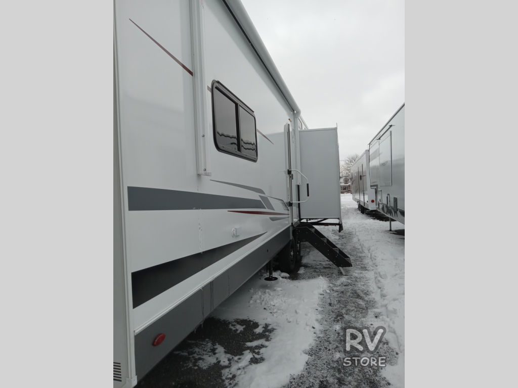 This fifth wheel is packed with features to make each trip enjoyable! The middle kitchen might be your favorite room with wrap-around counter space, a pantry, and a 16 cu. ft. 12V refrigerator for food storage. You can dine at the hi-top table and chairs here, or sit in the front living area on the dual sofas and theater seating! This area can become your guests bedroom at night since there are dual opposing slides and wardrobe storage for their things. You will also find a full-length wardrobe in the rear private bedroom, along with a king bed slide out, plus washer and dryer prep! And of course there is a full bath so everyone can stay clean each day!