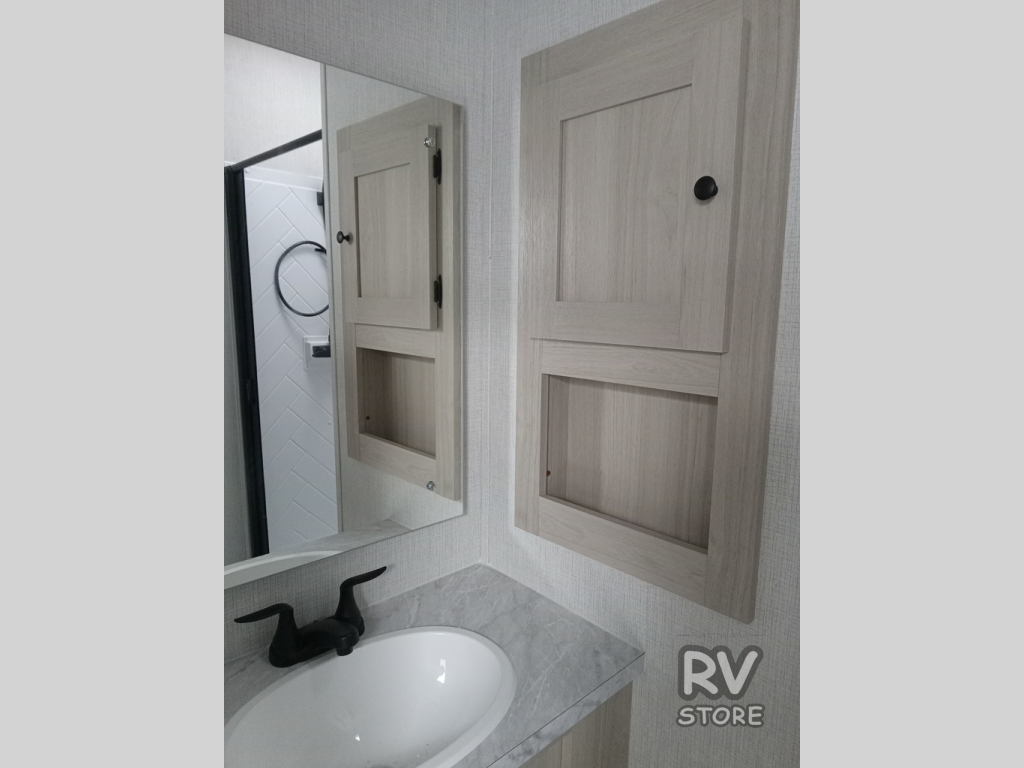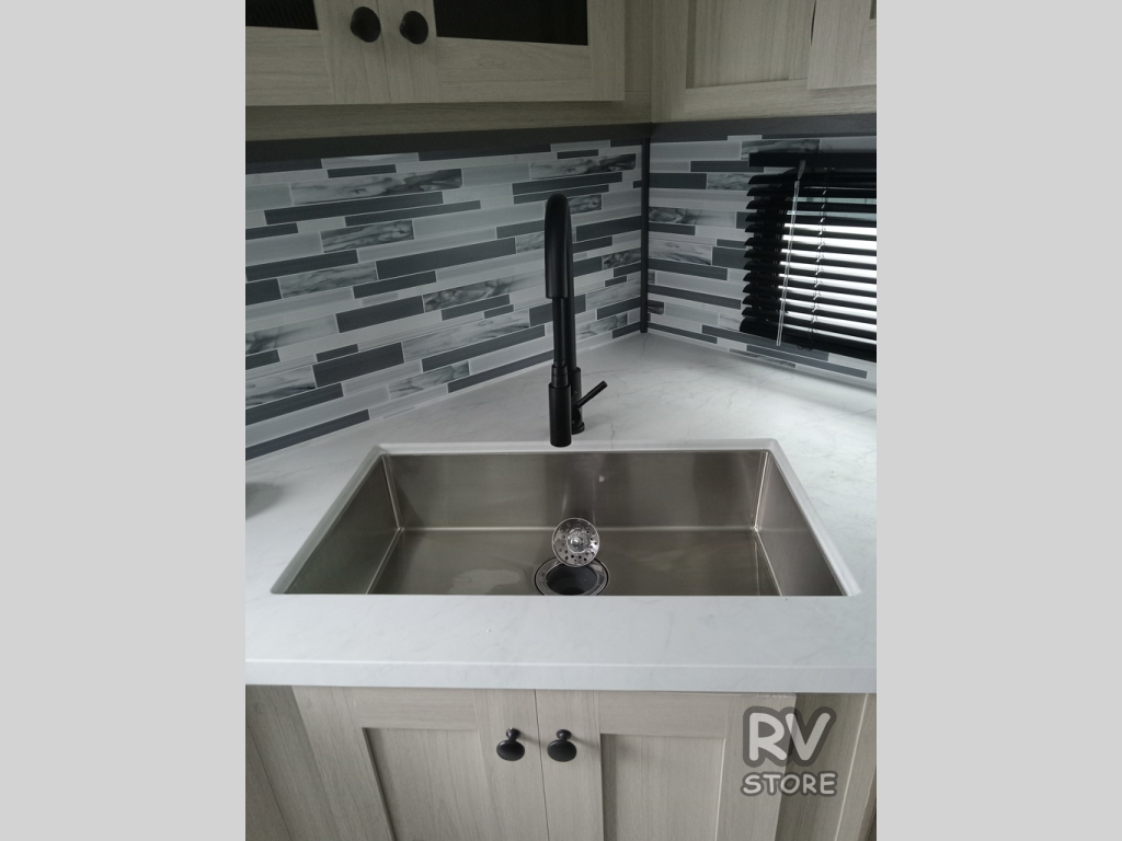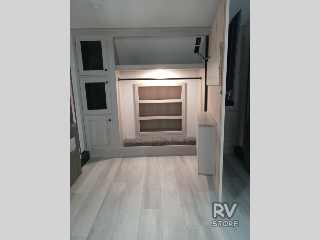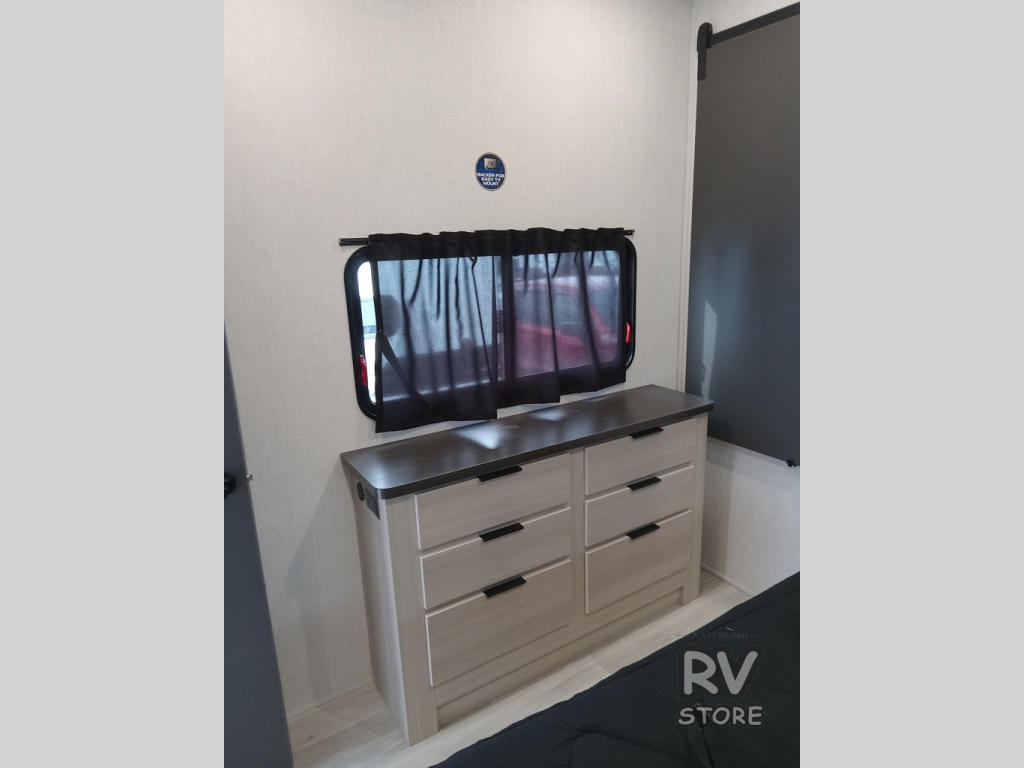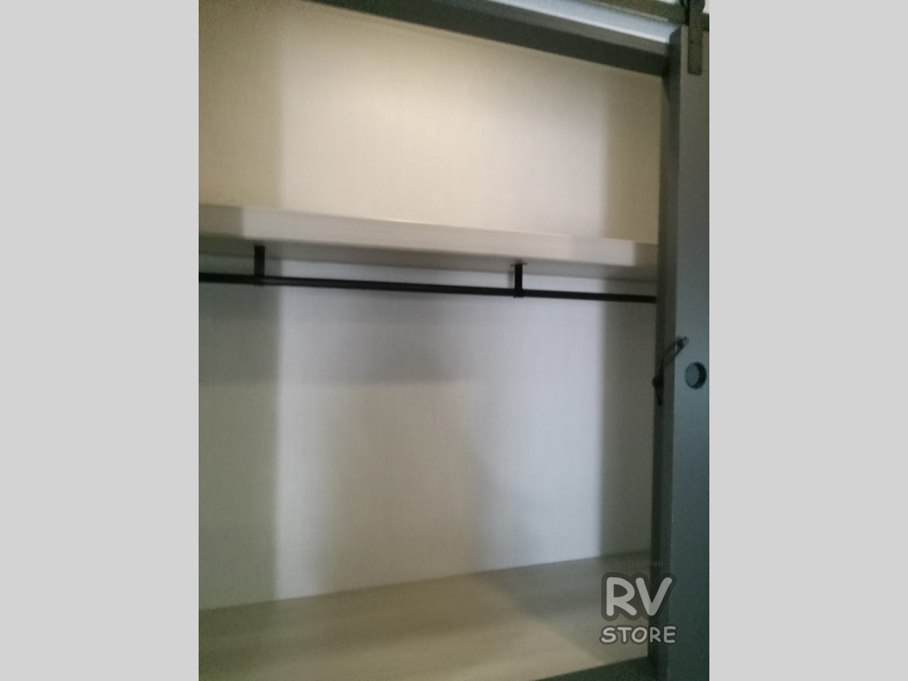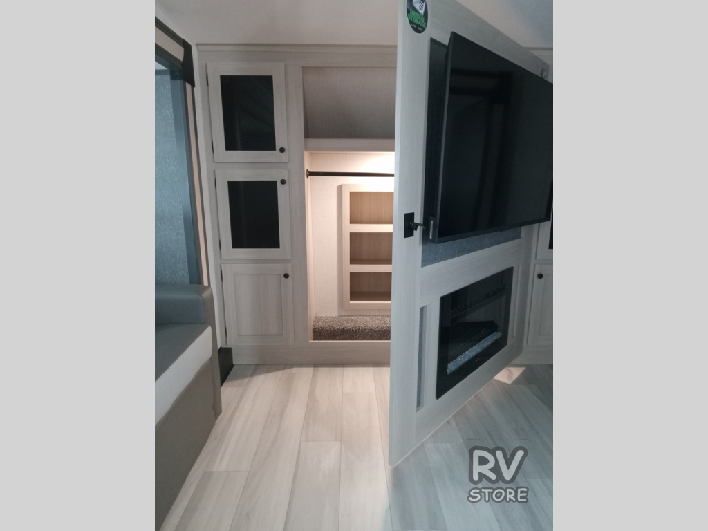 This fifth wheel is packed with features to make each trip enjoyable! The middle kitchen might be your favorite room with wrap-around counter space, a pantry, and a 16 cu. ft. 12V refrigerator for food storage. You can dine at the hi-top table and chairs here, or sit in the front living area on the dual sofas and theater seating! This area can become your guests bedroom at night since there are dual opposing slides and wardrobe storage for their things. You will also find a full-length wardrobe in the rear private bedroom, along with a king bed slide out, plus washer and dryer prep! And of course there is a full bath so everyone can stay clean each day!