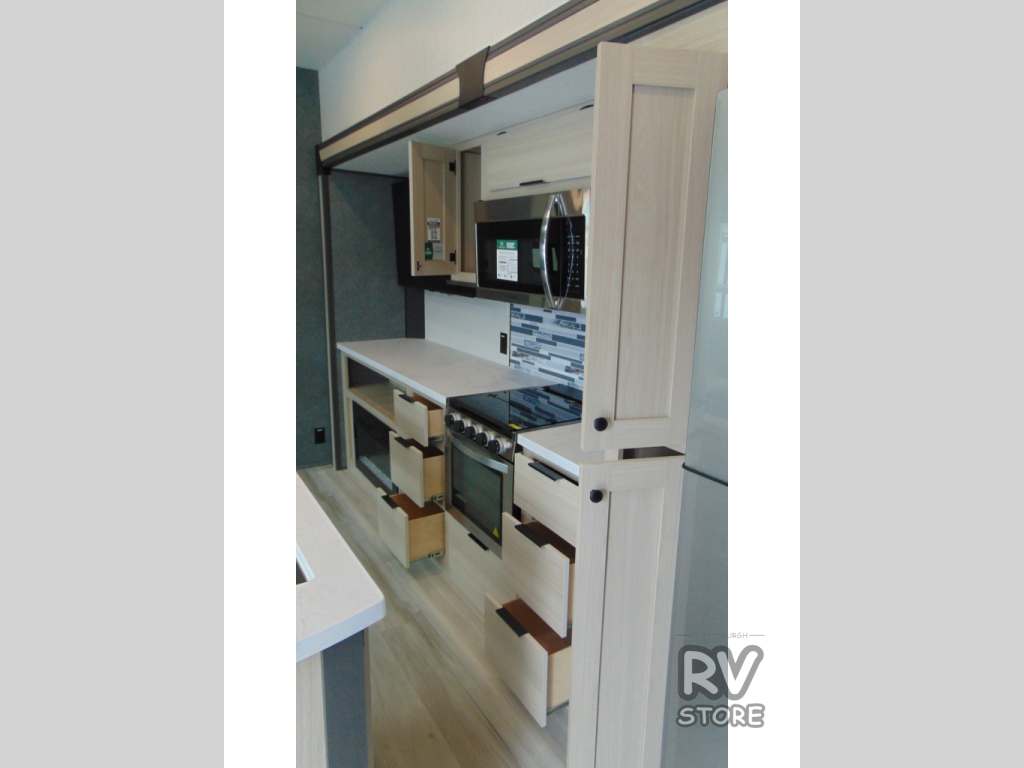 With any Cardinal fifth wheel by Forest River, you will enjoy affordable luxury at every turn. These models are constructed with residential fiberglass insulation in the roof and floor, a heated and enclosed underbelly armor, and a vacuum bonded, welded aluminum structure for added strength and durability. You will also find seamless roto-cast holding tanks, an outdoor shower, and 4-point auto leveling for quick and easy setup. There are carpet-free living spaces, residential backsplash, motion lighting throughout, and many more comforts!