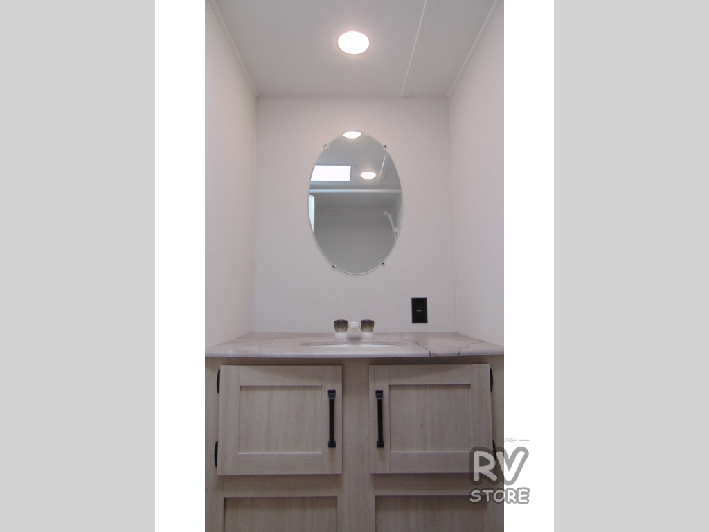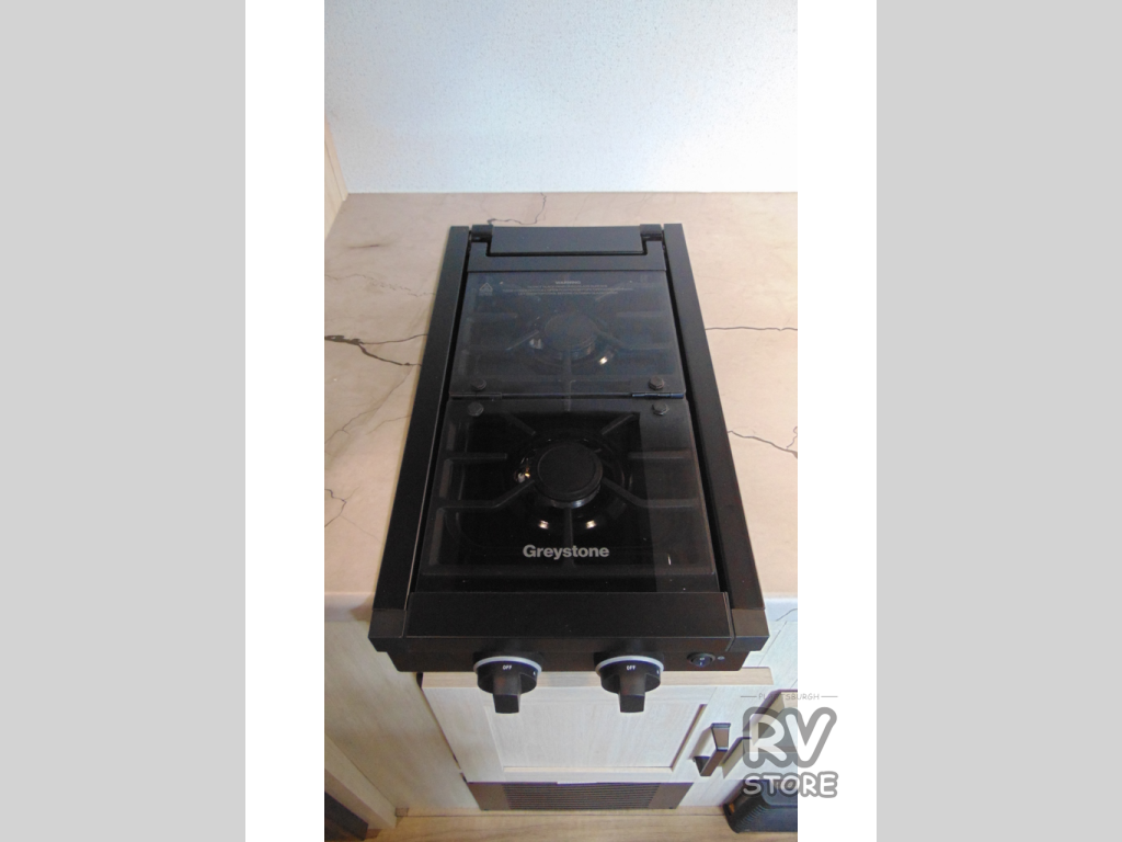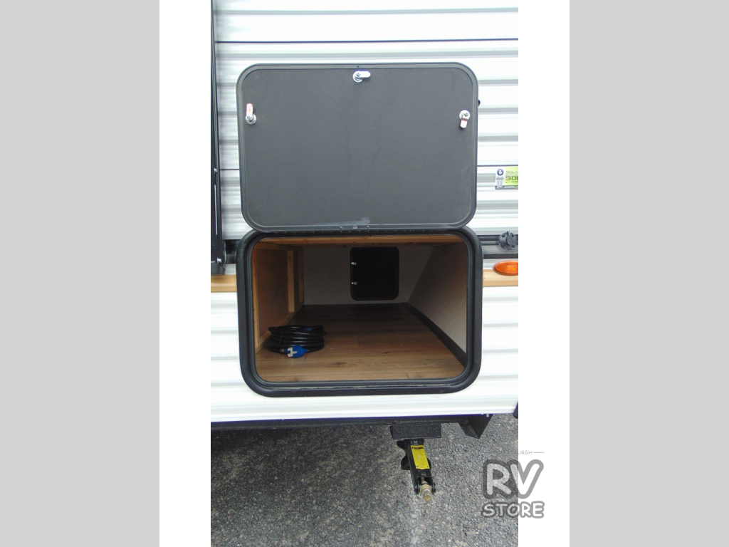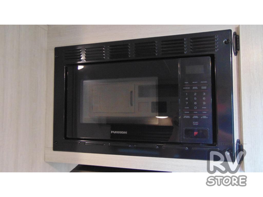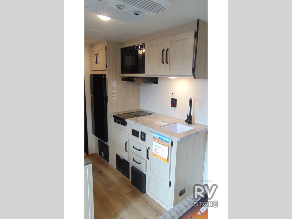 This single axle travel trailer is one you won't want to pass up! There is a front RV queen bed with a bedside shirt closet and overhead shelf for your things, and one more adult or two little ones can sleep on the booth dinette. A full kitchen includes a stainless two burner cooktop and stainless microwave to cook meals each day, and the 4.3 cu. ft. 12V black glass refrigerator will keep your food fresh. This model also includes a full rear bath with a toilet, sink, and 36" x 30" shower for easy cleaning up!
