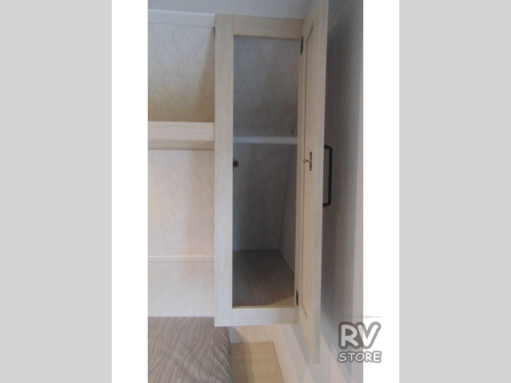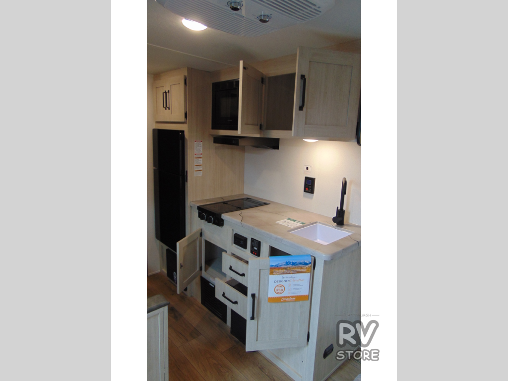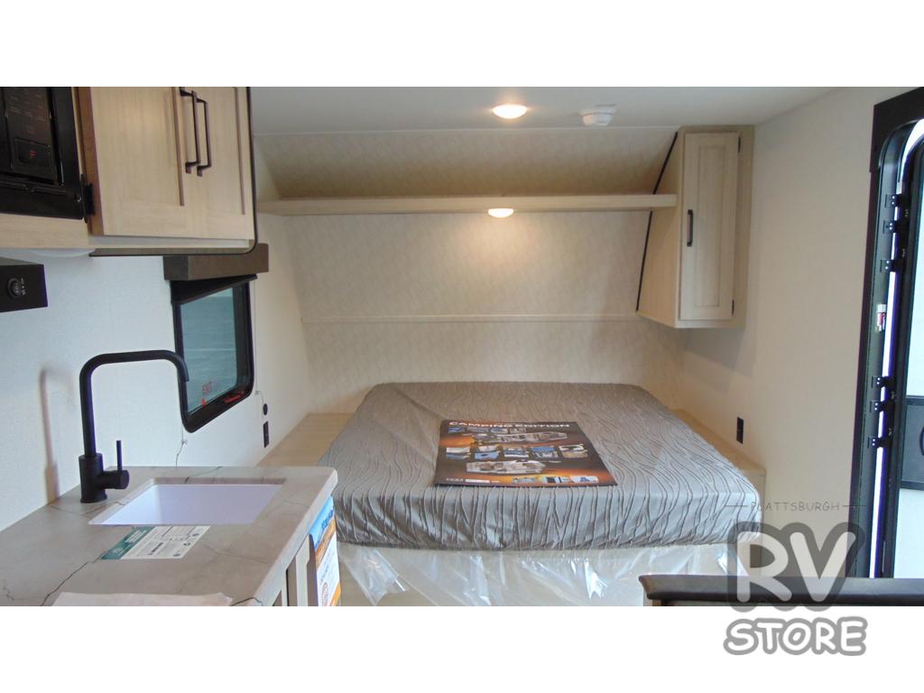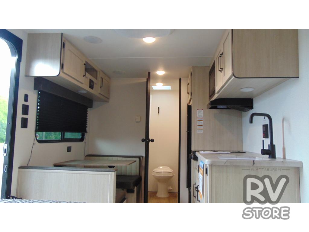 This single axle travel trailer is one you won't want to pass up! There is a front RV queen bed with a bedside shirt closet and overhead shelf for your things, and one more adult or two little ones can sleep on the booth dinette. A full kitchen includes a stainless two burner cooktop and stainless microwave to cook meals each day, and the 4.3 cu. ft. 12V black glass refrigerator will keep your food fresh. This model also includes a full rear bath with a toilet, sink, and 36" x 30" shower for easy cleaning up!