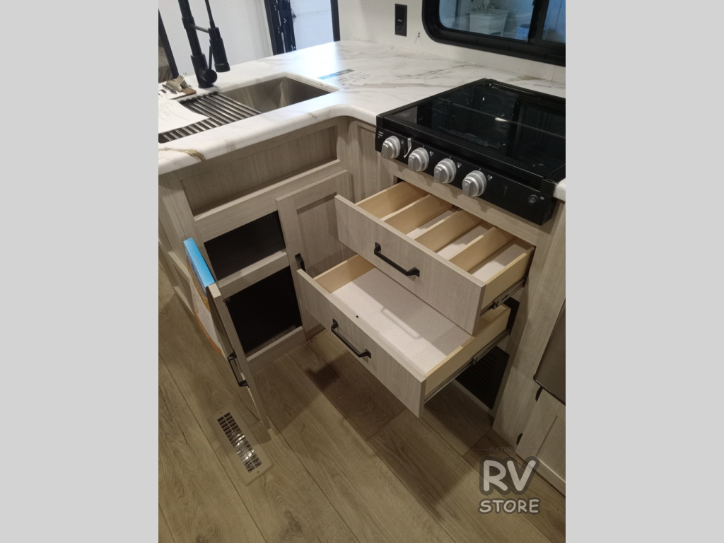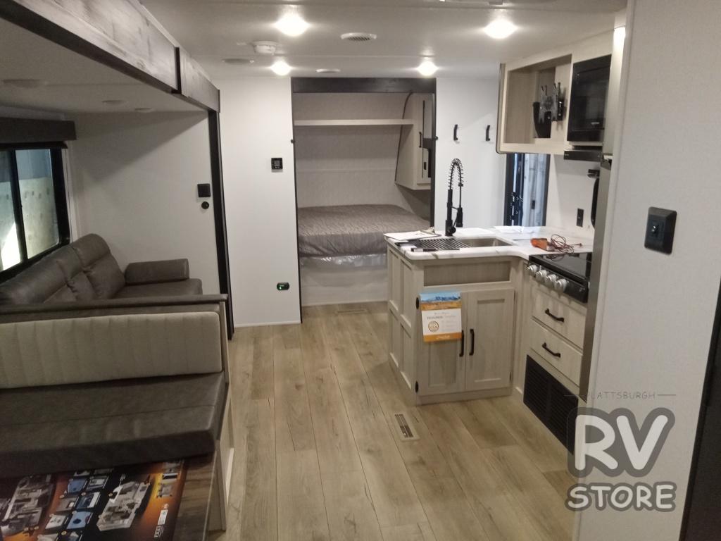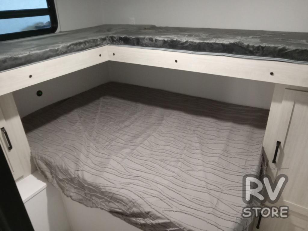 If you're looking for more space, this double axle unit features a large slide so you can walk about freely. Here, you'll find the booth dinette and sofa, which sit across from the optional TV if you want to enjoy movie nights. The full kitchen includes a stainless microwave and three burner cooktop to make meals, plus a pantry and 12V refrigerator for food storage. And an optional outside mini kitchen with a grill can be added if you enjoy cooking outdoors! Your guests or littles are sure to enjoy the rear bedroom with a queen bed, a 28" x 65" bunk, 28" x 76" bunk, a shirt closet, and a wardrobe so everything has a place!