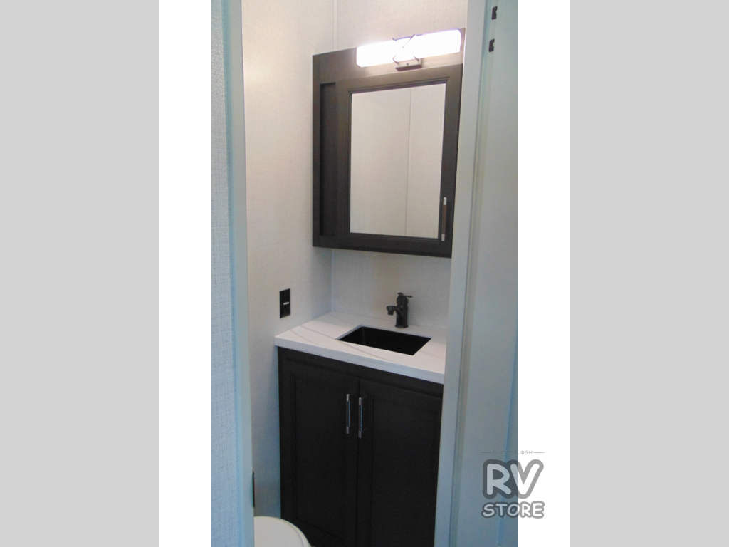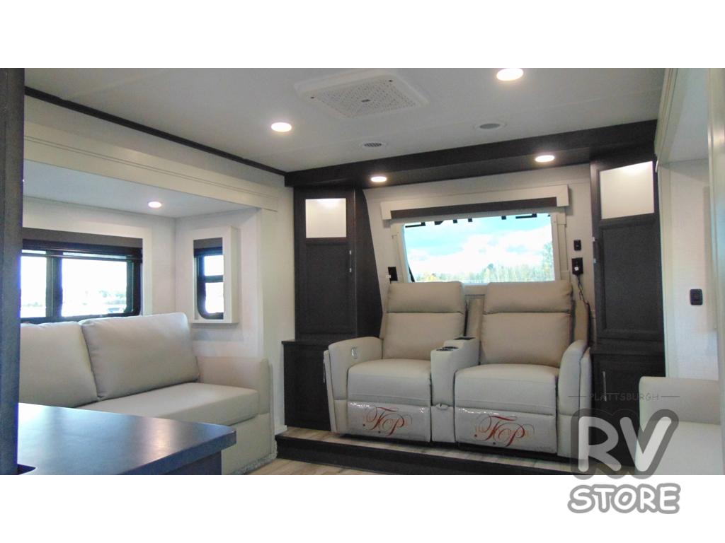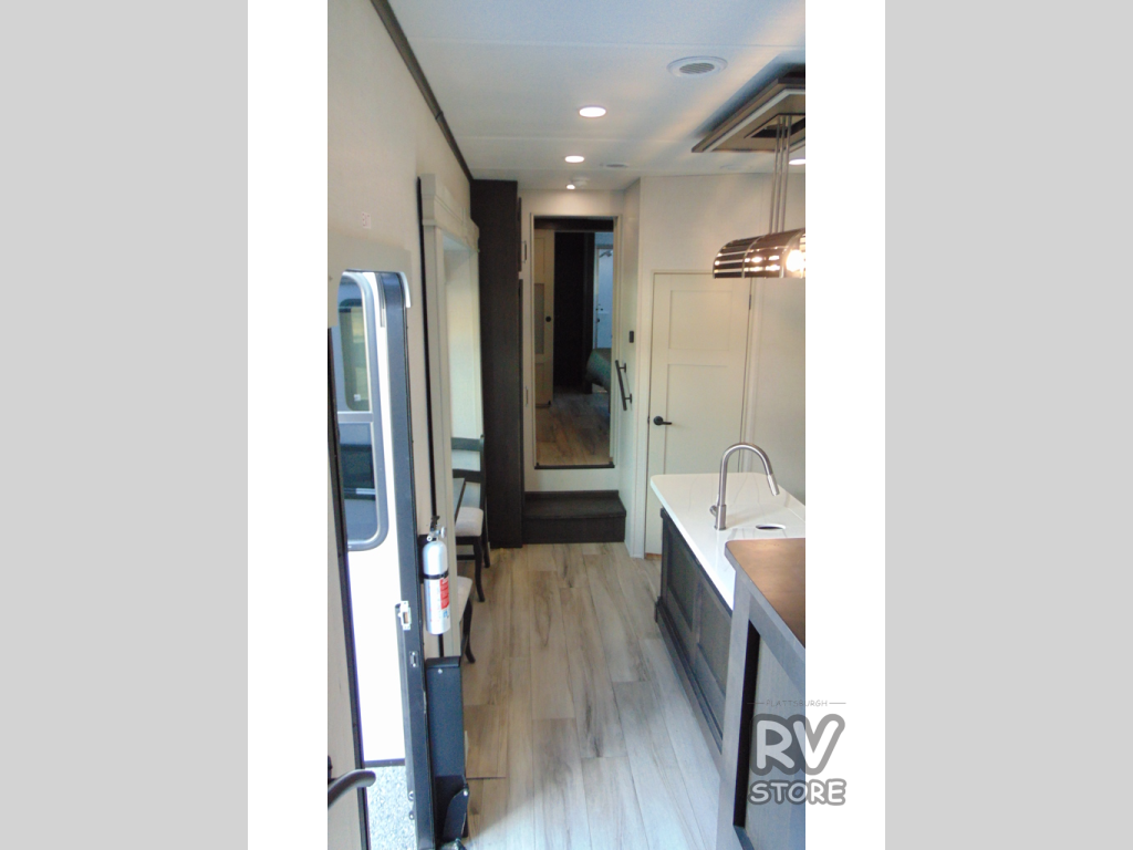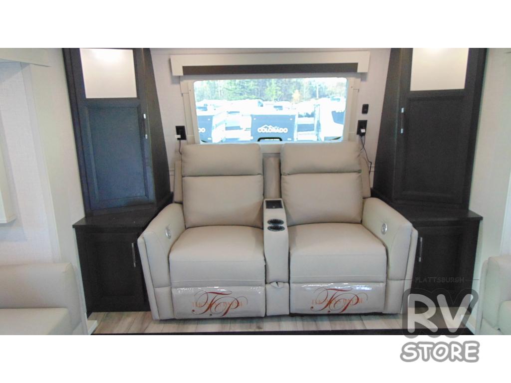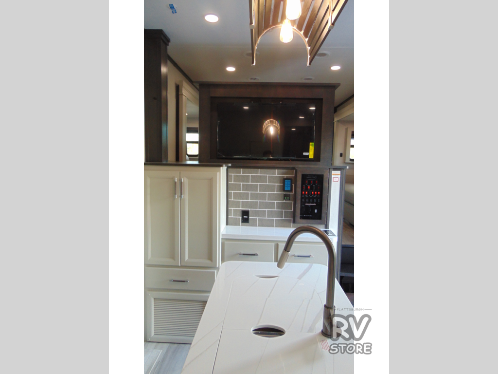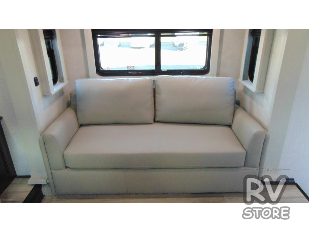 Find the comfort and luxury in this fifth wheel! Imagine your morning coffee on the spacious middle kitchen, and prepping your favorite breakfast on your kitchen island with a sink, making for a good meal-prep zone for endless cooking possibilities. You can start your favorite movie queued up in the living room with dual hide-a-bed sofas and a fireplace that sets the mood for comfort and delight every day. When it is time to unwind, your private rear bedroom welcomes you with a king bed, smart storage, and soft lighting that turns travel into rest, featuring a master bathroom with all you need to freshen up and treat yourself with plenty of storage, a dual sink vanity, and space for a washer/dryer prep for your convenience.
