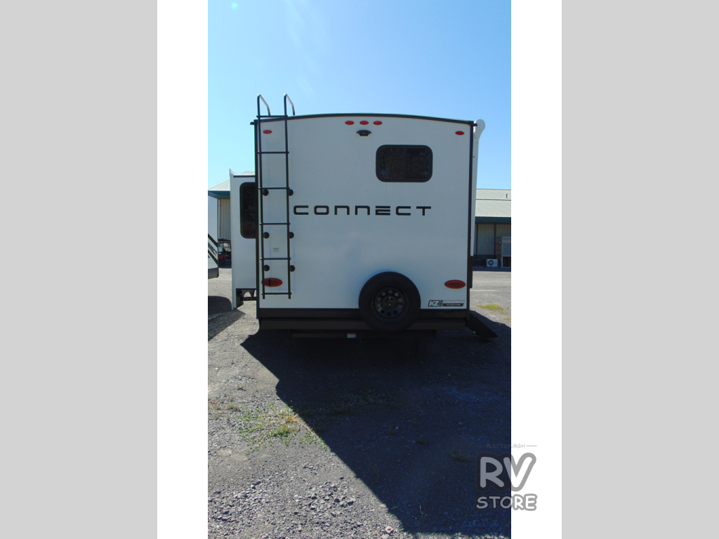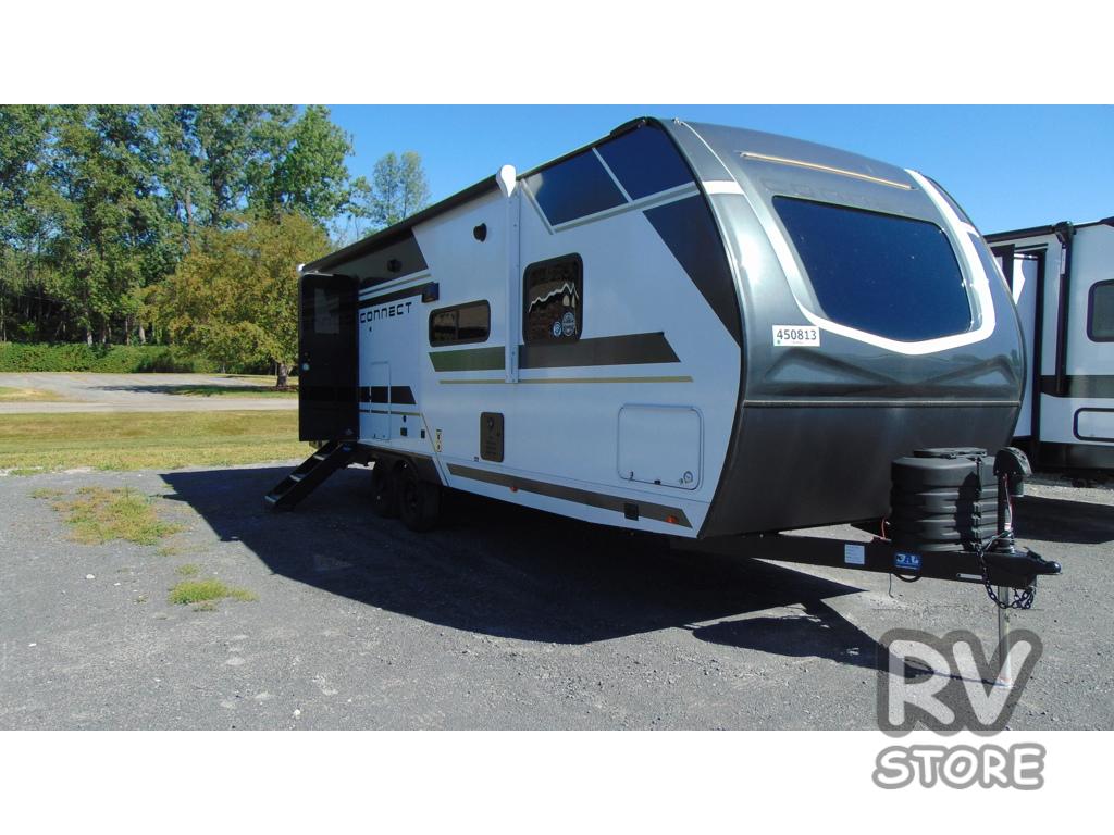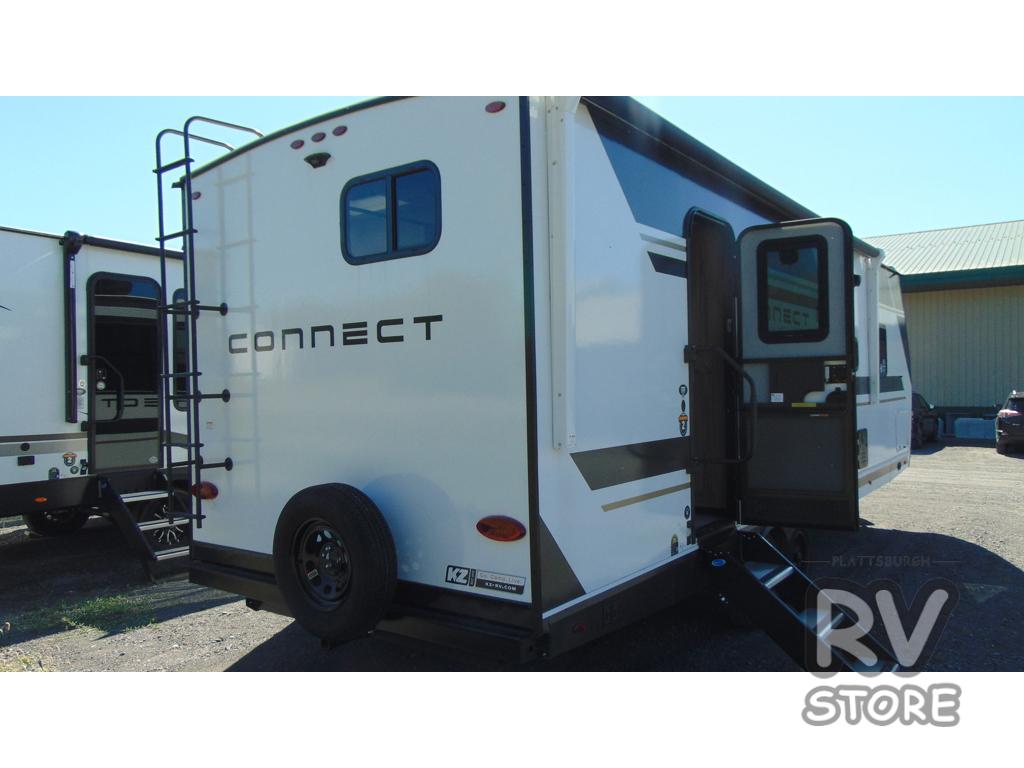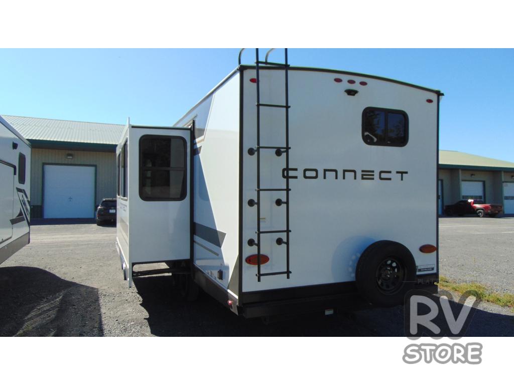 Your needs will be met and your desires will be fulfilled with this Connect travel trailer! Probably the thing you miss most when you camp is your comfortable bed back at home, and that's exactly why this trailer comes with a Serta Comfort foam king mattress in the private bedroom. The other thing you are prone to miss is your bathroom, and the full rear bathroom on this trailer is an excellent replacement with its 30" x 36" shower, skylight, linen closet, MaxxAir vent, porcelain foot-flush toilet, and dual sink vanity. Sit back on the hide-a-bed sofa and enjoy a night of relaxation in front of the LED TV and 34" fireplace. You can even grab a couple of drinks from the 10 cu. ft. 12V refrigerator, snacks from the walk-in pantry with coat hooks, or you can make it a fun evening by playing a game together at the booth dinette.