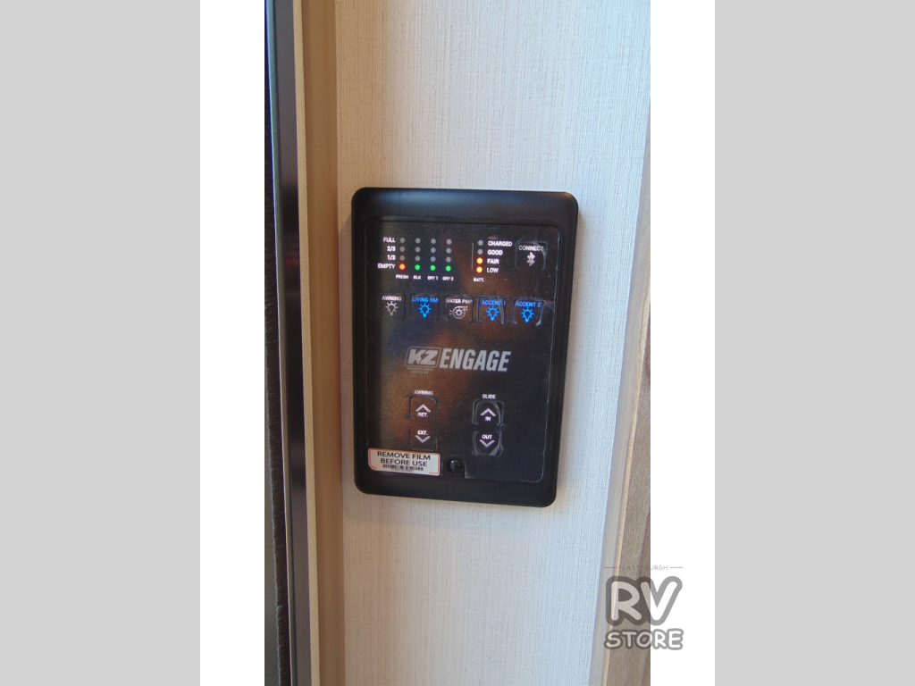 The KZ Connect travel trailer comes with an RV Airflow System which optimizes the airflow for your air conditioner by increasing the airflow by an average of 40%. This improves performance, speeds up cooling times, and reduces noise in your trailer. Some of the other helpful features found on the Connect are the heated, insulated, and enclosed underbelly, the exterior docking station, the fiberglass front cap with front windshield, the 82" interior ceiling height, and the protective front diamond plate. There are some useful technological features, like the two LED motion-sensor lights, the HDMI and USB charge, and the multi-media entertainment system with a DVD player. The KZ Engage is powered by OneControl, and it monitors battery levels and controls slide rooms, the leveling system, the awning, inside/outside lighting, and the TPMS prep.
