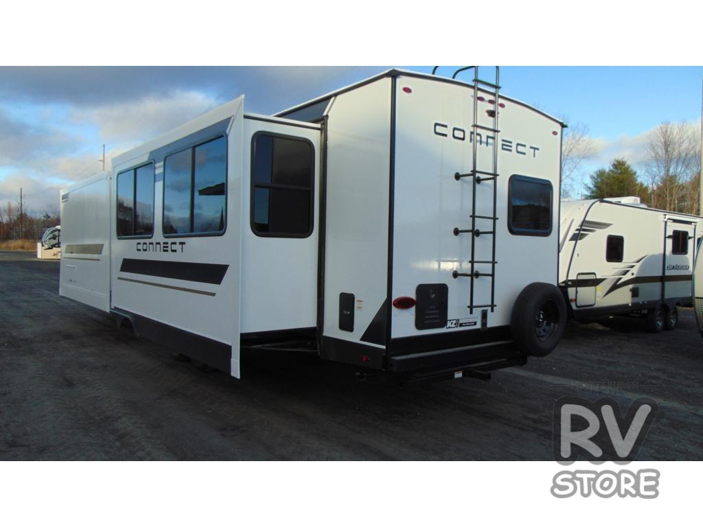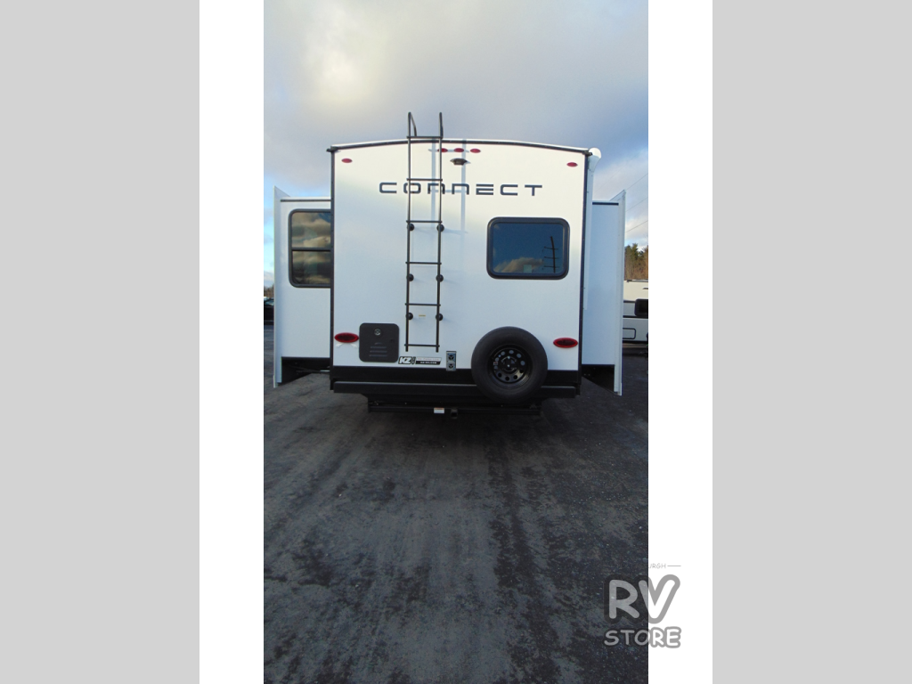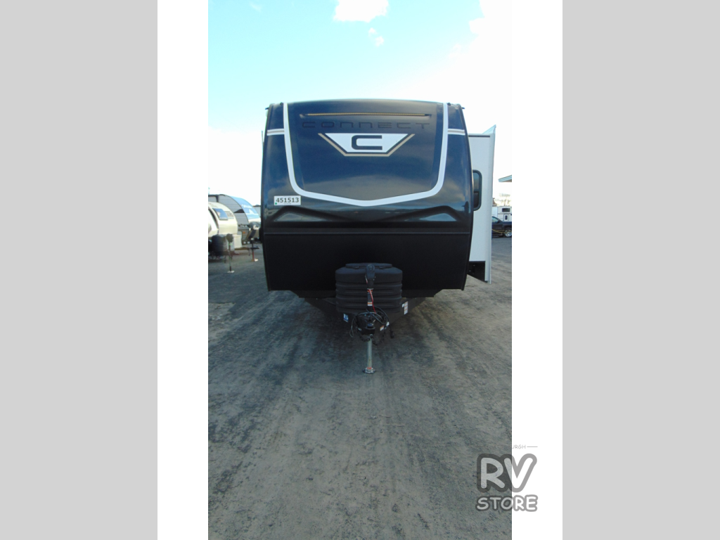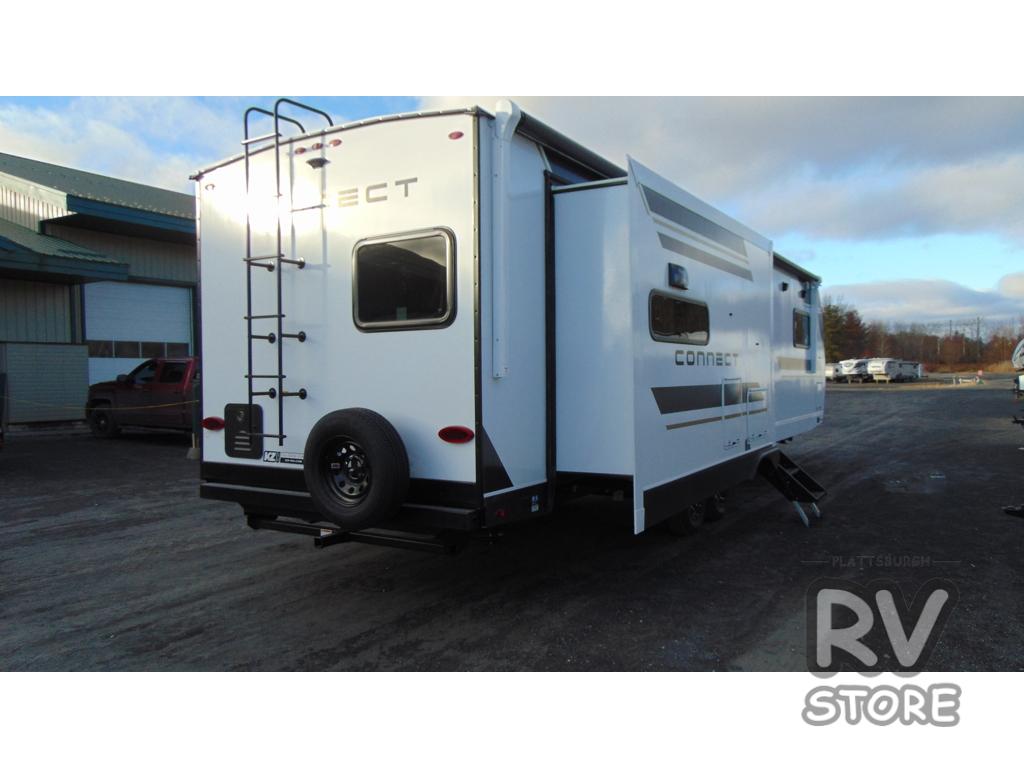 Imagine capping off a relaxing day by the lake with a rejuvenating rinse in the spacious 30" x 36" shower of your KZ Connect travel trailer. Afterward, step into the private bedroom to grab a fresh outfit from the front walk-in closet and dresser. The bedroom is a true sanctuary, featuring a king bed slide and an area prepped for an optional washer and dryer perfect for extended trips! Need to catch up on email? The bedroom also includes a convenient built-in desk, offering a private spot for work or study. In the main living area, you'll find everything you need to easily prepare a delicious meal. The kitchen boasts a three-burner range, a microwave, a 10-cu. ft. 12V refrigerator, and a convenient kitchen island for maximum prep space. Plus, you’ll love the dedicated coffee bar area, keeping your morning routine separate and the main counter clear. When it's time to eat or just relax, invite friends to join you on the hide-a-bed sofa and booth dinette. You can enjoy the outdoors too, you will find two power awnings with LED lights that create a comfortable, illuminated patio space.