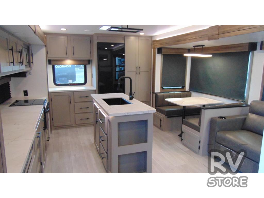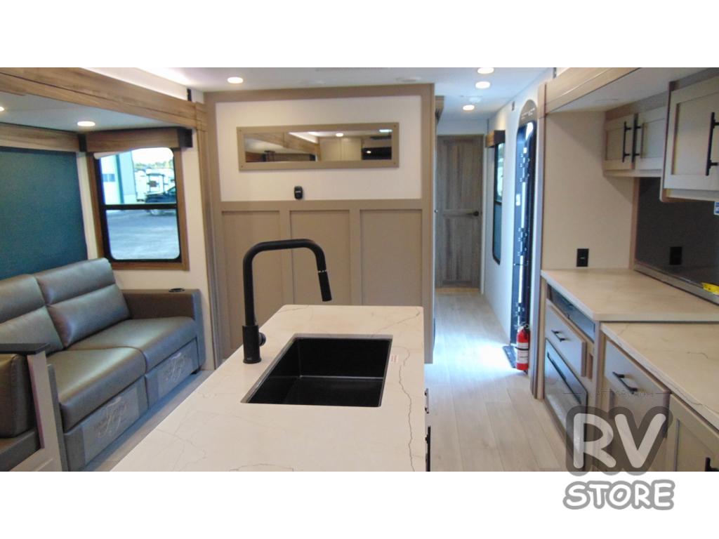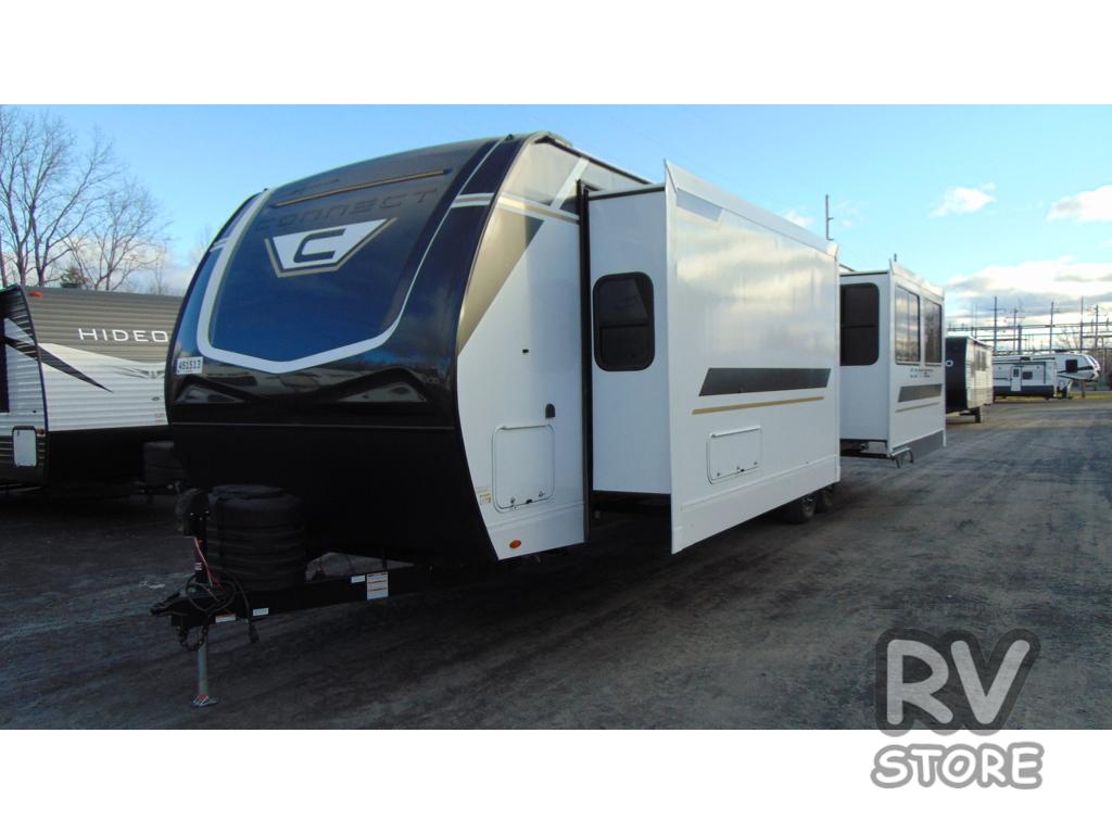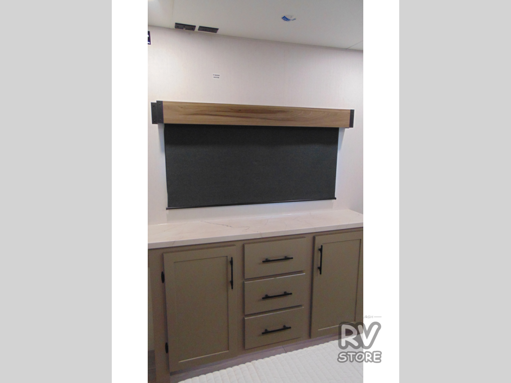 Imagine capping off a relaxing day by the lake with a rejuvenating rinse in the spacious 30" x 36" shower of your KZ Connect travel trailer. Afterward, step into the private bedroom to grab a fresh outfit from the front walk-in closet and dresser. The bedroom is a true sanctuary, featuring a king bed slide and an area prepped for an optional washer and dryer perfect for extended trips! Need to catch up on email? The bedroom also includes a convenient built-in desk, offering a private spot for work or study. In the main living area, you'll find everything you need to easily prepare a delicious meal. The kitchen boasts a three-burner range, a microwave, a 10-cu. ft. 12V refrigerator, and a convenient kitchen island for maximum prep space. Plus, you’ll love the dedicated coffee bar area, keeping your morning routine separate and the main counter clear. When it's time to eat or just relax, invite friends to join you on the hide-a-bed sofa and booth dinette. You can enjoy the outdoors too, you will find two power awnings with LED lights that create a comfortable, illuminated patio space.