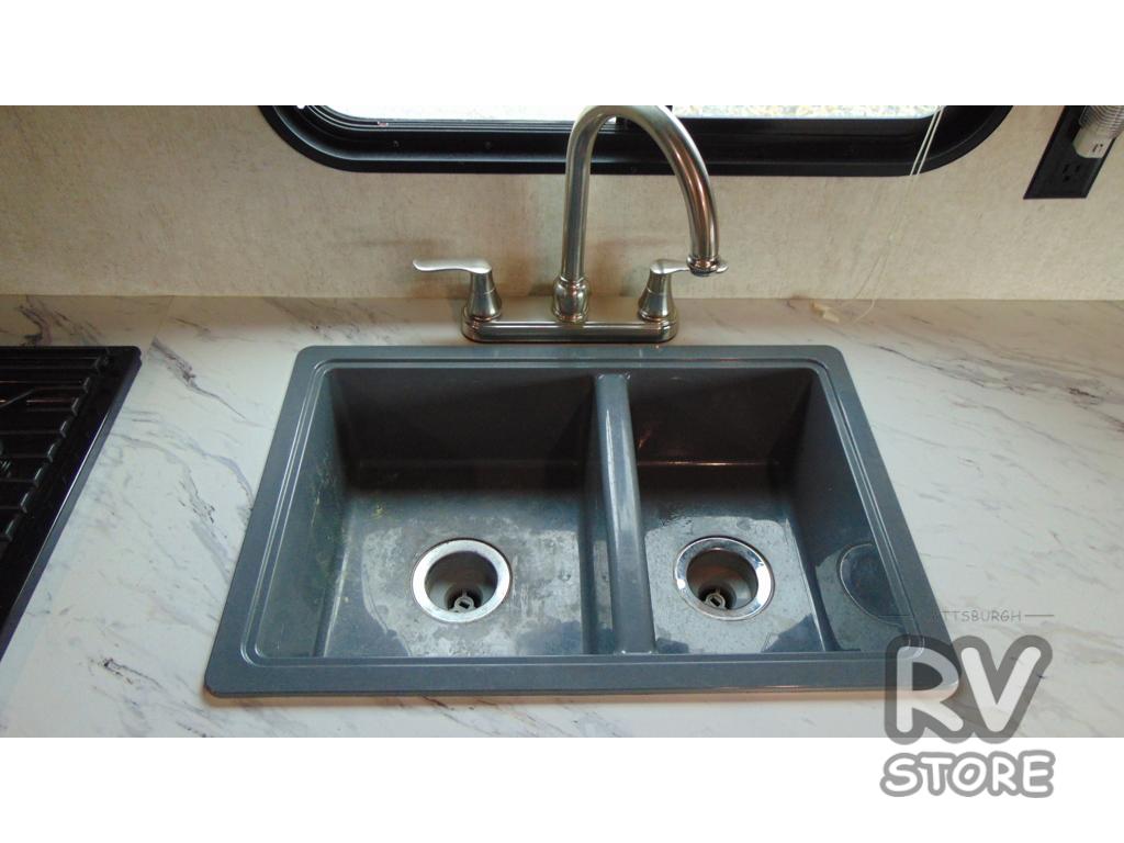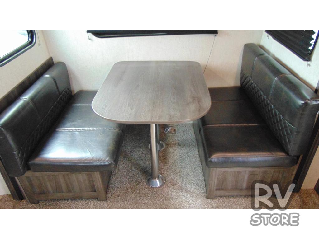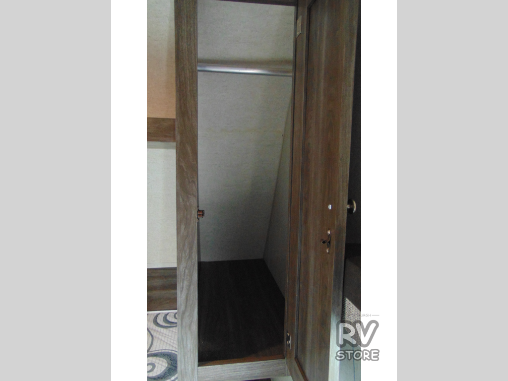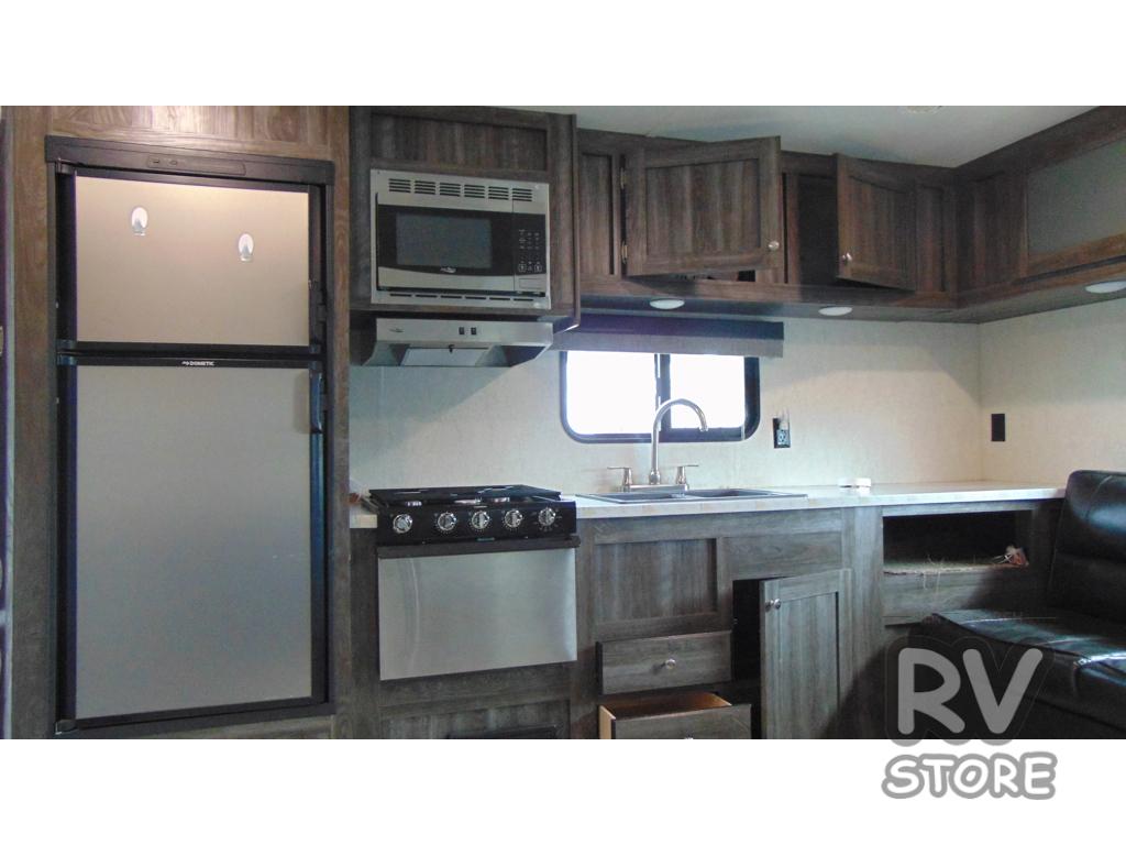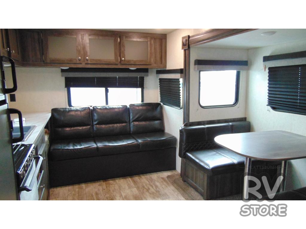 You can make meals, get cleaned up and sleep with your own accommodations anywhere you stop in this travel trailer. The cook will enjoy the full kitchen amenities across from the dinette slide, and the rear sofa is perfect to take a nap on. The furniture also provides extra sleeping space when needed. The front private bedroom provides a queen bed and quick access to the full bathroom at night. Don't worry about storage, you will find plenty throughout, plus the exterior pass-through compartment comes in handy for those larger items such as golf clubs, fishing poles, and such.