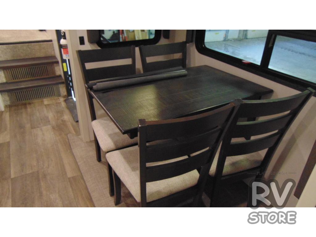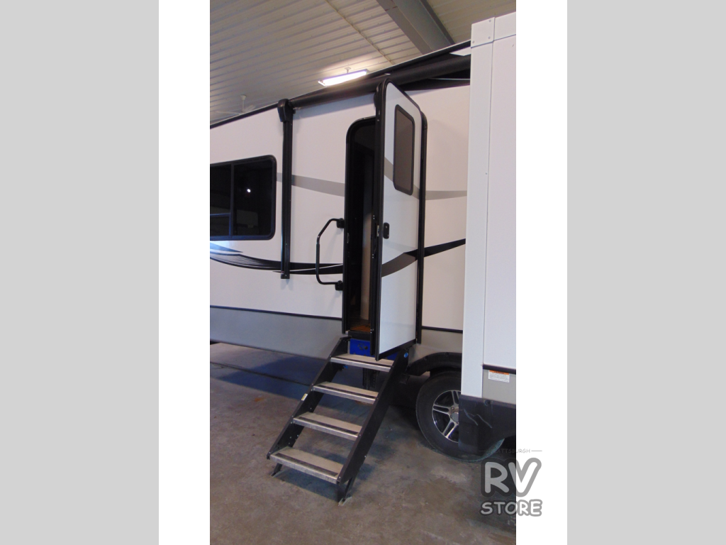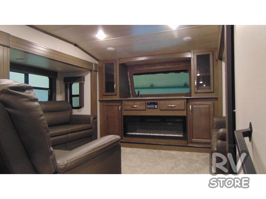 Man cave, TV room, family space, and/or extra bedroom are a few ways you can use the front living area with a pop-up TV that has a fireplace below. Everyone will have seating with two tri-fold sleeper sofa slides and two theater seats, and/or some might decide to play games at the legless dinette table or choose the free standing dinette option in the separate kitchen. The dual entries offer a smooth flow of traffic when the whole family is with you, and the spacious kitchen has lots of counter space, a pull-out pantry, and all the kitchen amenities needed to keep everyone fed. Access the full bathroom from the hallway to get cleaned up, and relax on your own queen bed in the rear bedroom whenever needed. You will find a closet prepped for a washer/dryer option, shoe garage underneath the bed, and three wardrobes for plenty of clothing storage.