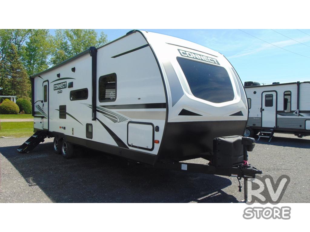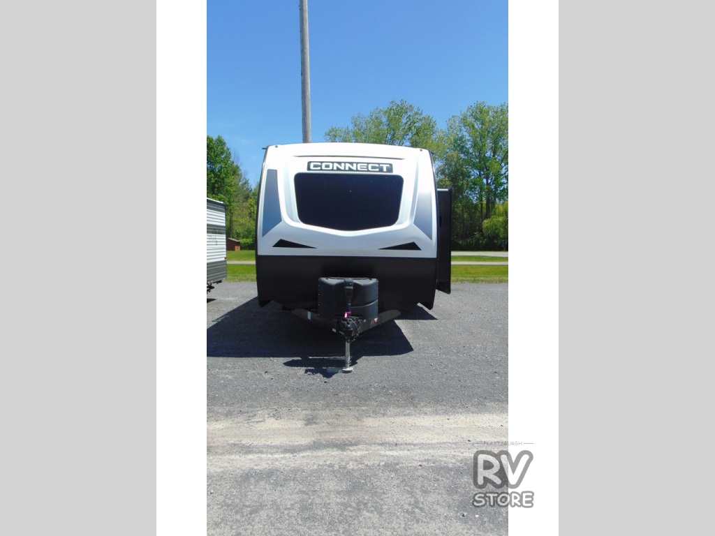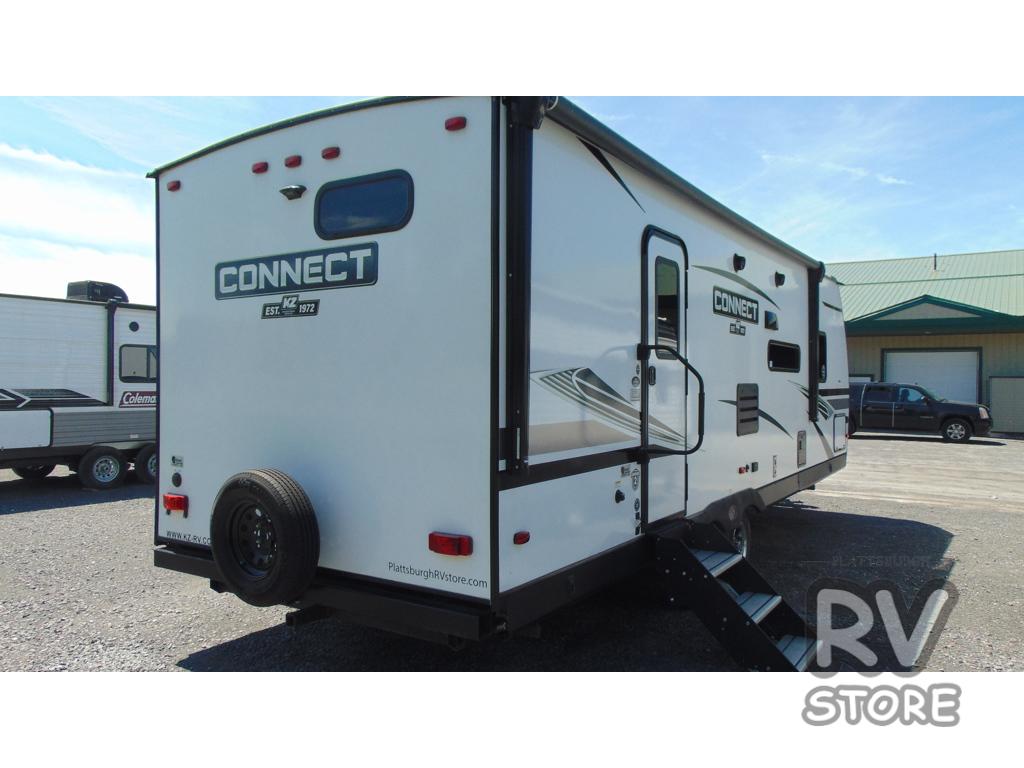 The KZ Connect travel trailer is a trailer with extreme style and creative floorplans! Wrapped up in a lightweight package, the Connect has gorgeous interior décor and a high-end fiberglass exterior. You will find a fiberglass front cap with front windshield, a power front jack, exterior speakers, a spare tire, Equa-Flex suspension, nitrogen-filled tires, a leash latch, and a heated, insulated, and enclosed underbelly, and that's just the beginning. There is still plenty more to check out, like the well-appointed interior that has a kitchen skylight, an HDMI/USB charging port, LED motion-sensor lights, an electric fireplace, and upgraded linoleum flooring.