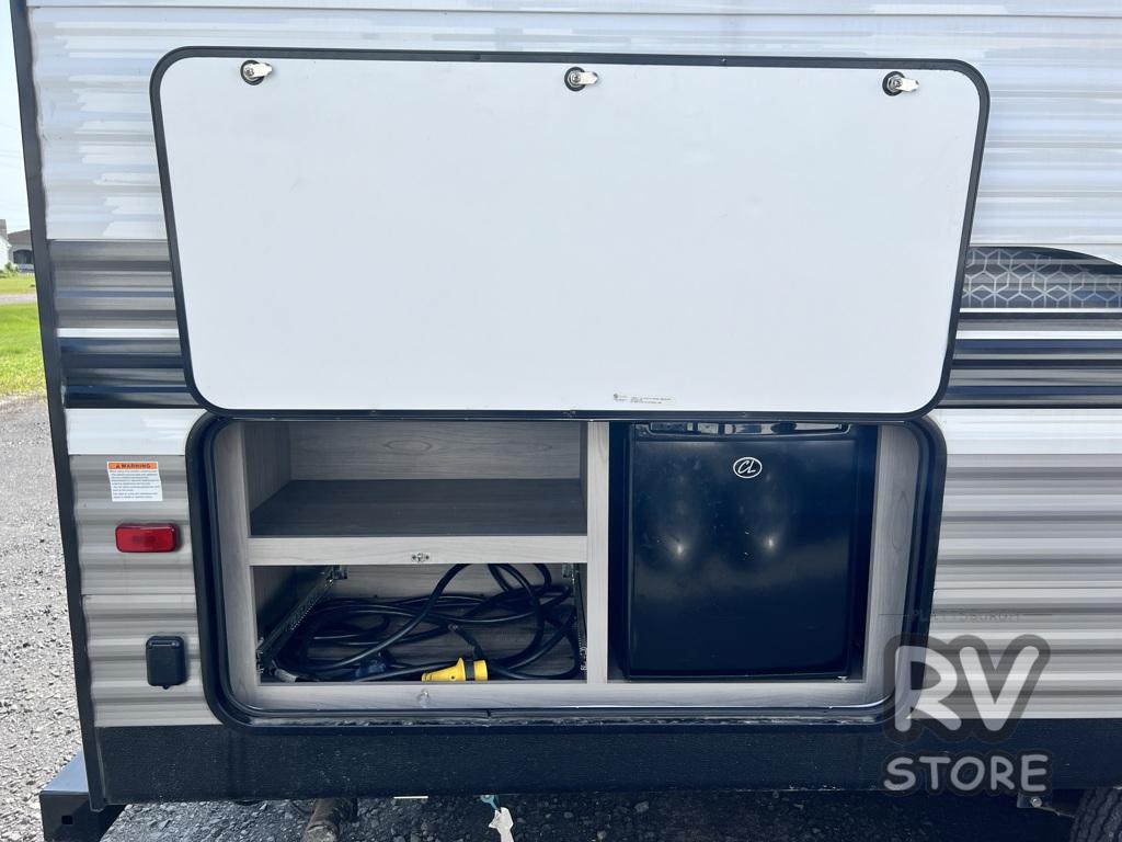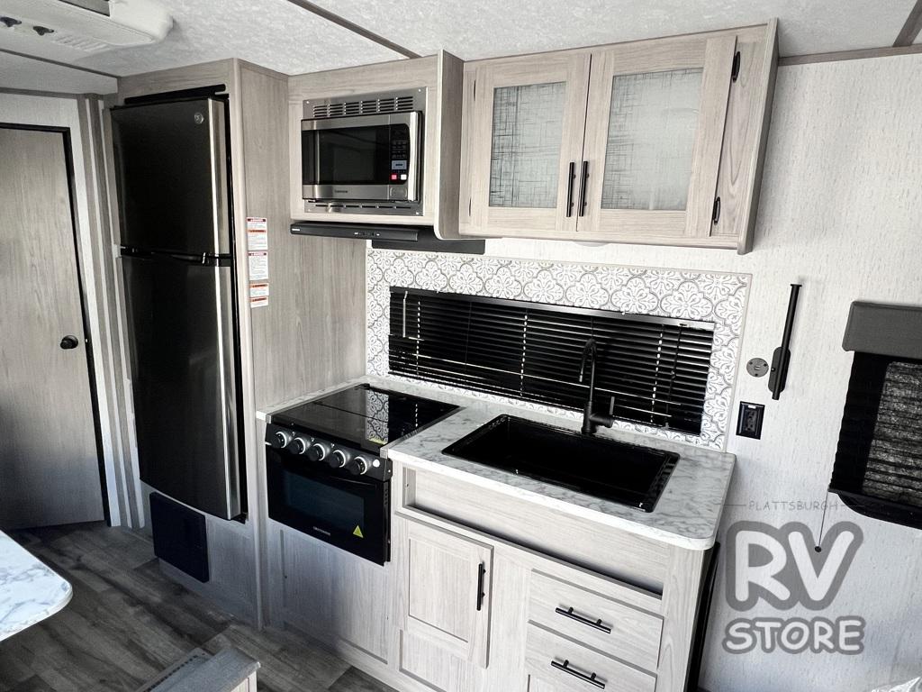 Escape the city life for weekends at the lake in this cozy travel trailer. Once you arrive at the campground, you can start lunch on the outdoor kitchen and relax under the power awning with LED lights. The little ones will love the bunk beds, and you'll have a queen bed up front. This model includes a full kitchen with an oven, a 10 cu. ft. refrigerator, and a microwave oven, plus there is a booth dinette where you can dine together.
