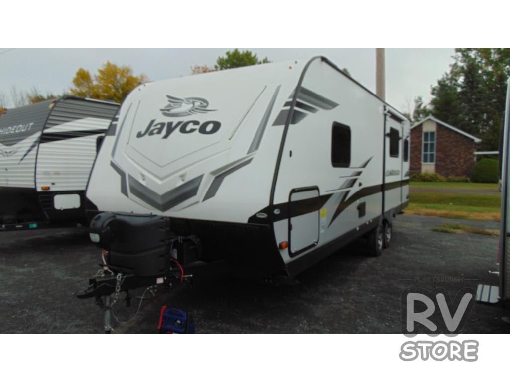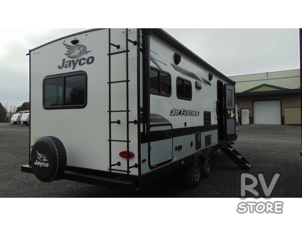 With any Jay Feather travel trailer by Jayco, you will experience an easy-to-tow, lightweight dual axle RV that is built on an American-made frame with an aerodynamic, rounded front profile with a diamond plate to protect against road debris, and includes Azdel composite in the perimeter walls, and Stronghold VBL vacuum-bonded, laminated floor and walls, plus the Magnum Truss roof system. Also included are features in the Customer Value package, and the Sport package which offers aluminum tread entry steps, roof-mount solar prep, an LED TV, and the Glacier package which includes an enclosed underbelly. The interior provides residential-style kitchen countertops with a decorative backsplash, residential plank-style vinyl flooring for easy care, a decorative wallboard for style, and ball-bearing drawer guides with 75 lb. capacity to mention a few of the amenities. Choose your favorite today!