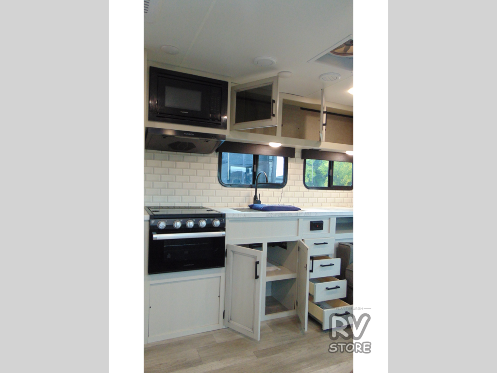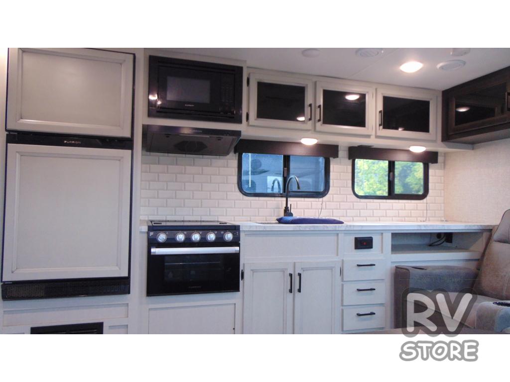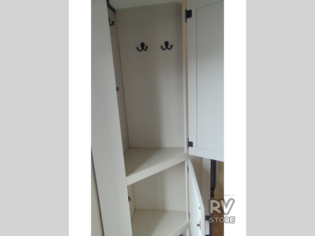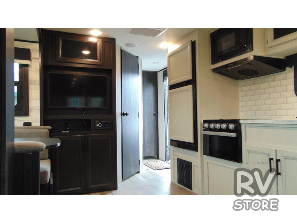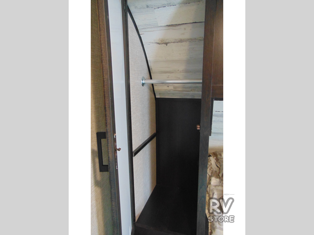 Camp at a local state park or travel to see new places with this trailer that can sleep four when you utilize the furniture as sleeping space. Two can sleep in the front bedroom on a queen bed with dual wardrobes and includes access to the double entry bathroom, while two others sleep on the booth dinette slide out, and the rear jackknife sofa. There is an LED TV in the main area to watch while everyone plans their activities or while the cook makes meals using full amenities. There is an outside fridge to store more cold items which is super handy when you are relaxing outside under the 20' power awning. You might even like to add a few options, take a look at the list.