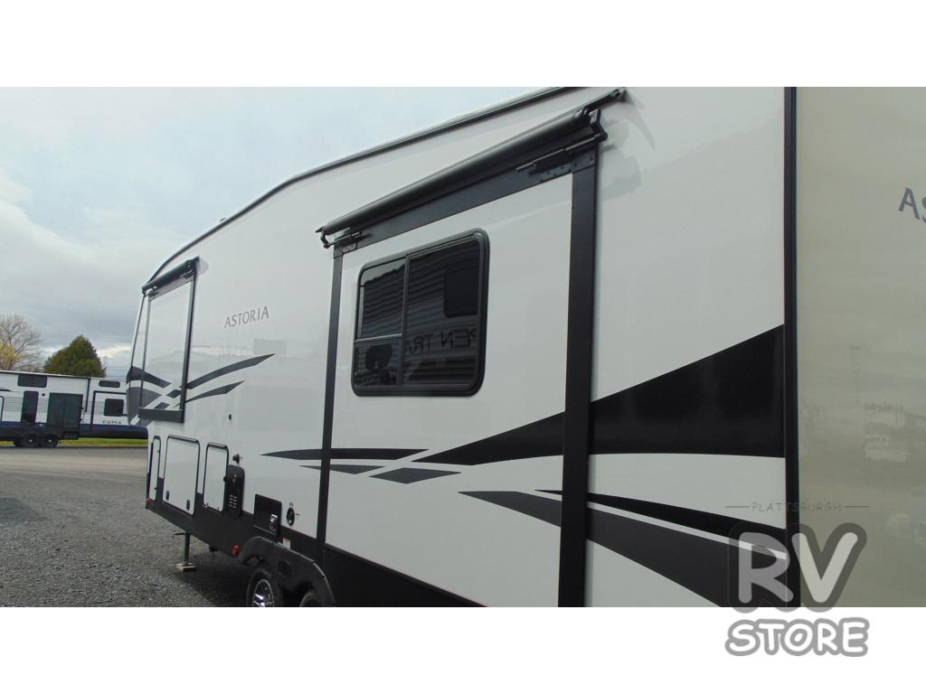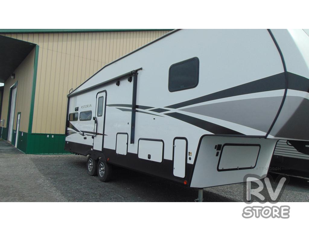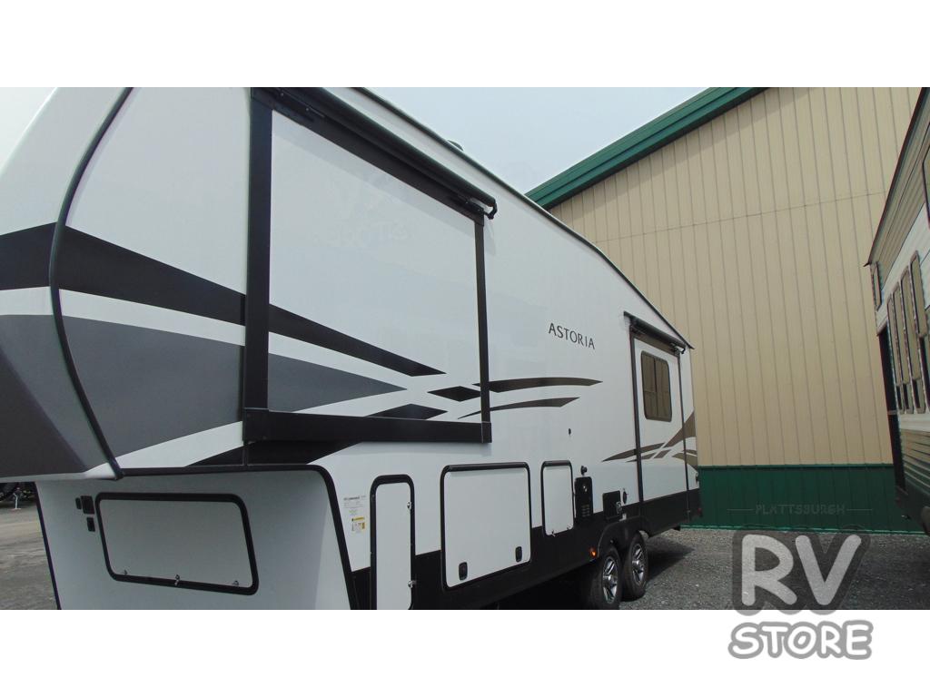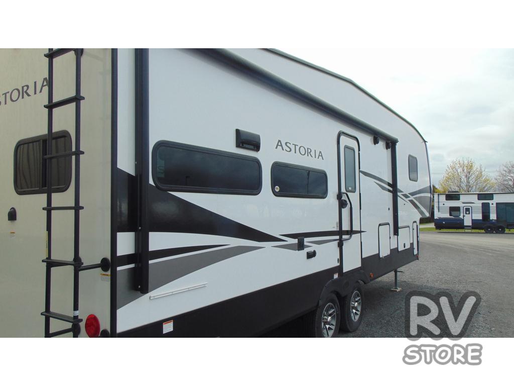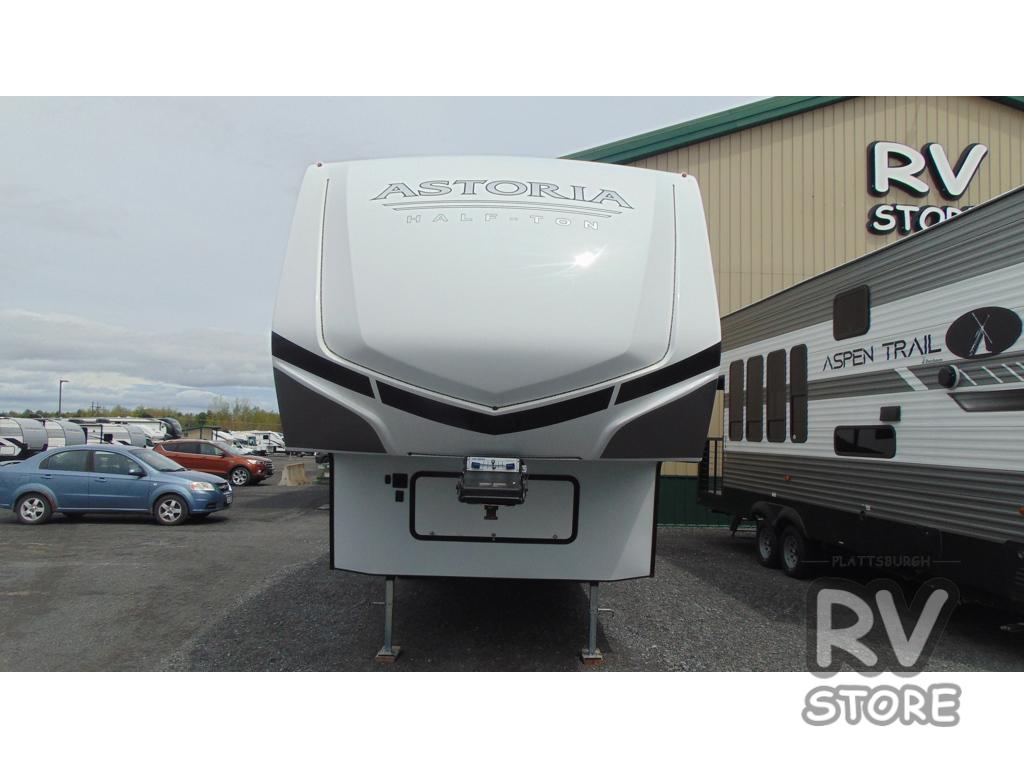Each one of these Dutchmen RV Astoria Half-Ton fifth wheels feature a fiberglass exterior for added durability and an All Weather Thermal Package so you can camp all year long! There are also Secure Stance entry steps, slam latch baggage doors, an outside shower port, and many more exterior conveniences. You'll enjoy a 200W solar panel for off-grid capabilities, a back up camera for easy parking, and a power awning with LED lights for an inviting outdoor space. The interior is designed with high-gloss acrylic backsplash, night shades throughout the living area, and slick black appliances. The 60,000 BTU tankless water heater will provide endless hot showers, and the dual ducted A/C will keep you cool all summer long.