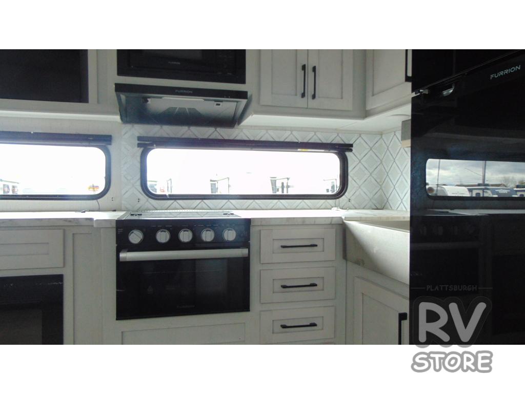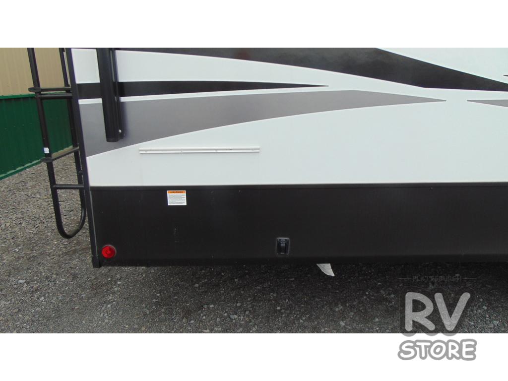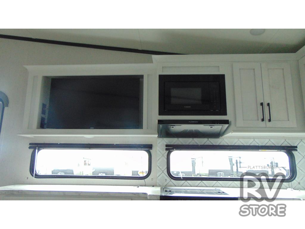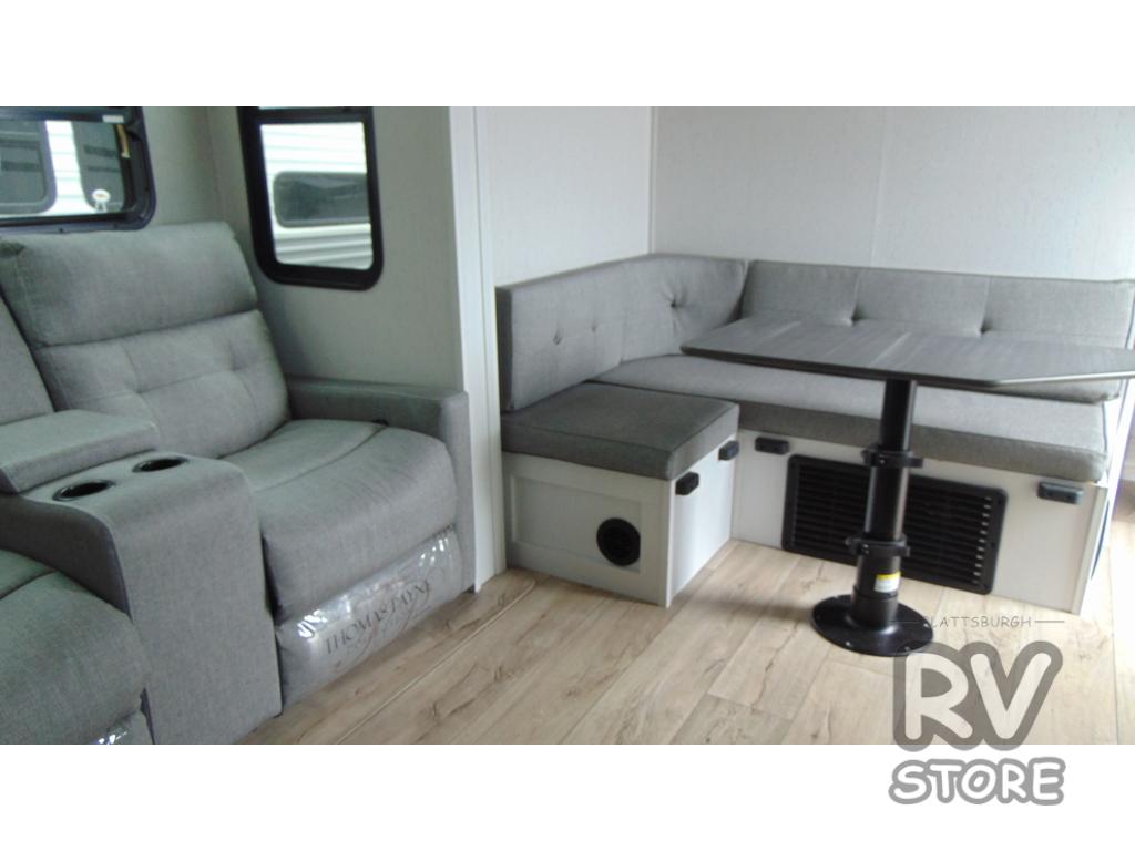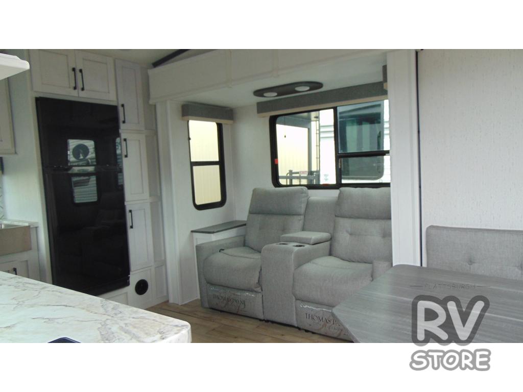 Plan to say awhile in this rear kitchen fifth wheel! You will fall in love with the front bedroom with a king bed slide out, large front closet, a dresser, plus a mounted TV for movies in bed. The rear kitchen includes plenty of space to prep meals, a farm style sink, plus a 10 cu. ft. 12V refrigerator and a pantry for food storage! You can get cozy on the theater seating slide out or at the cafe dinette, and the LED TV will ensure you'll never go bored on rainy days!